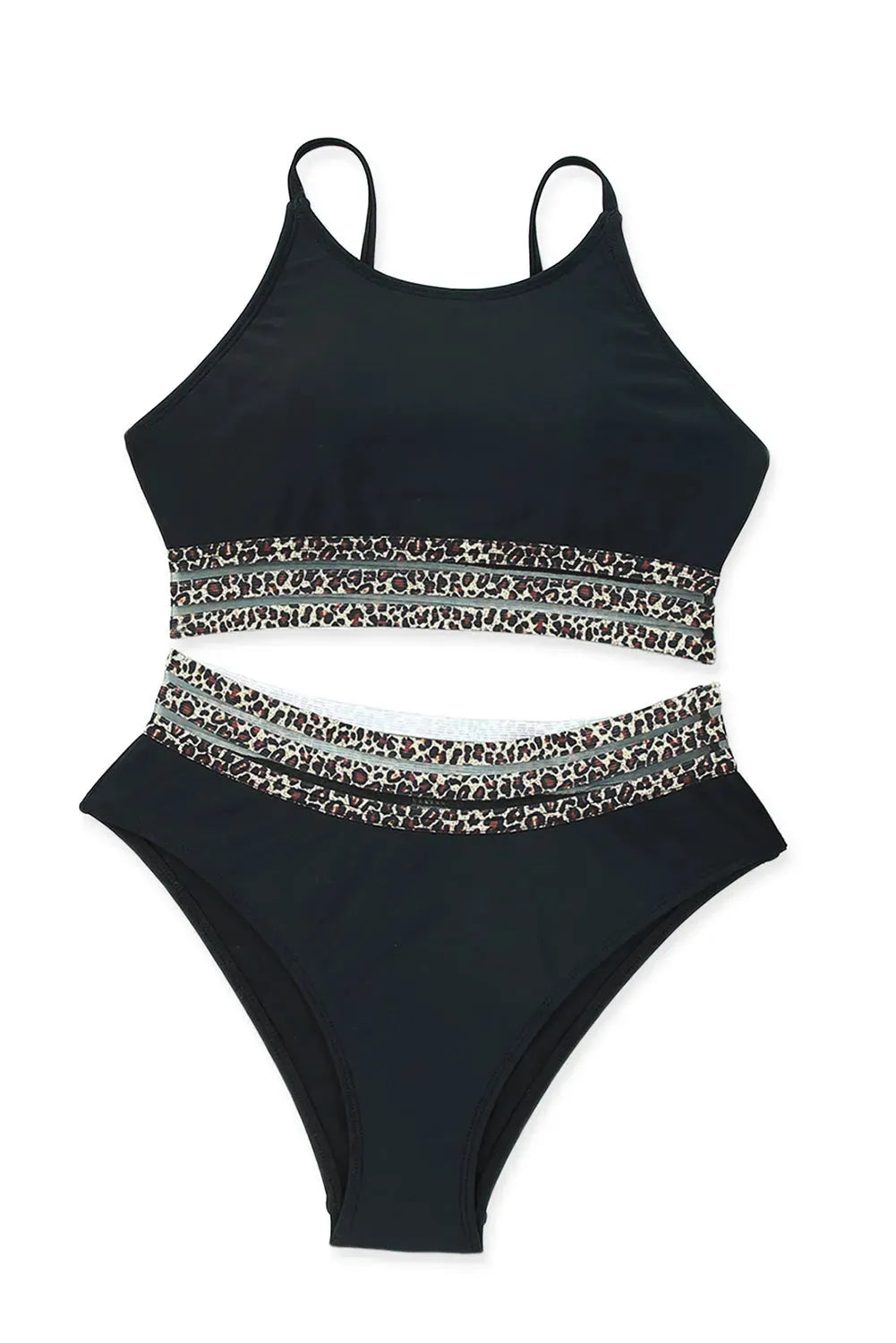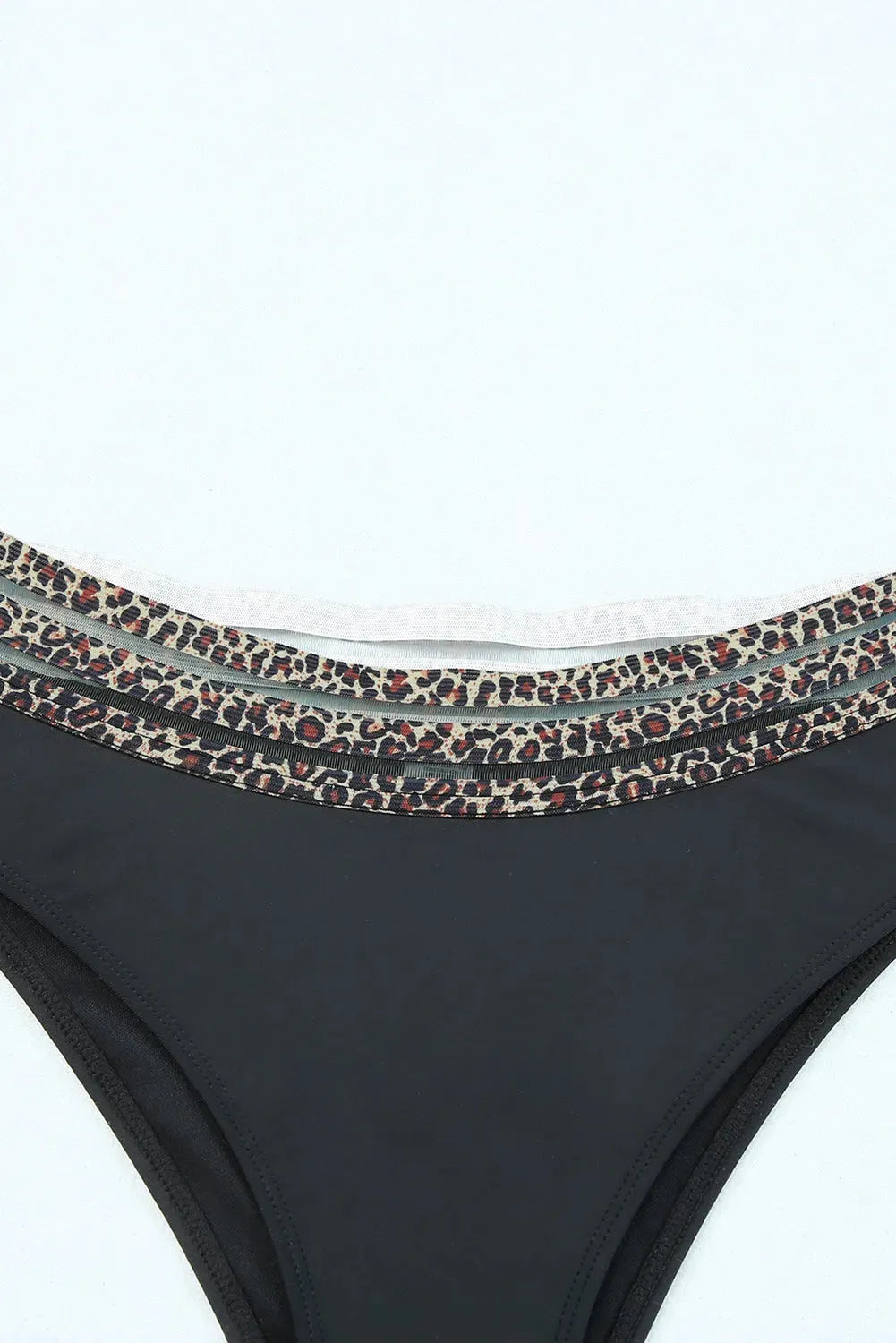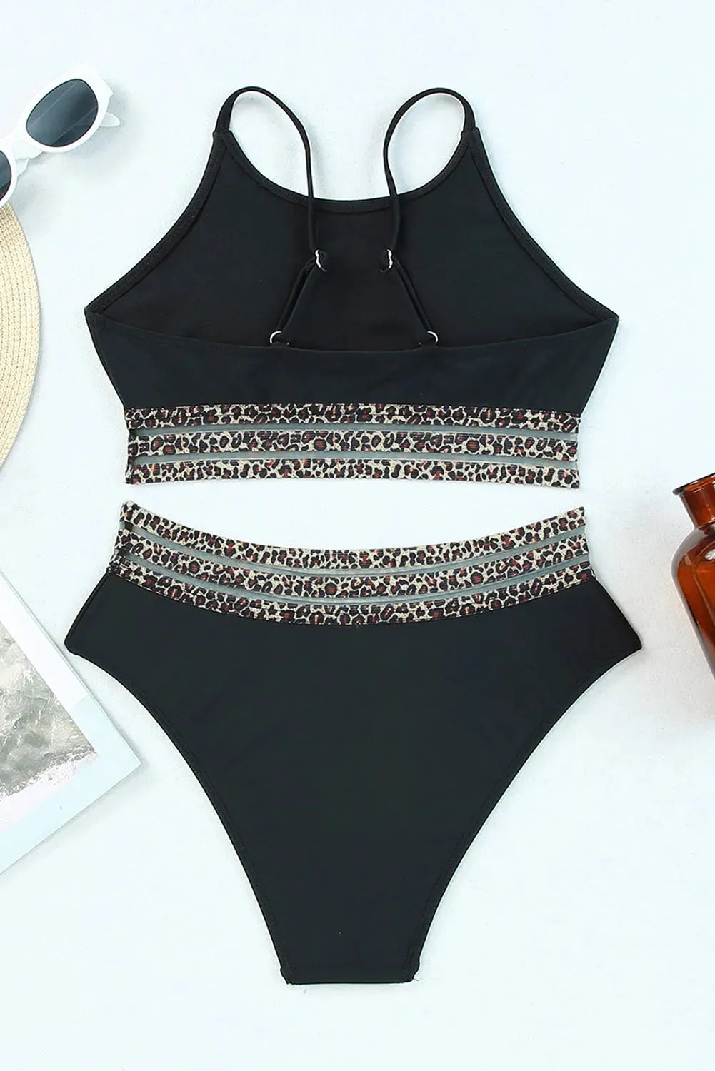 • Athletic two-piece bikini set characterized by leopard mesh trim