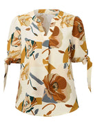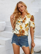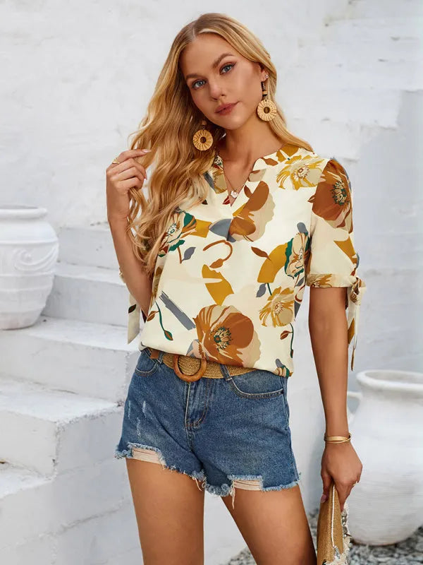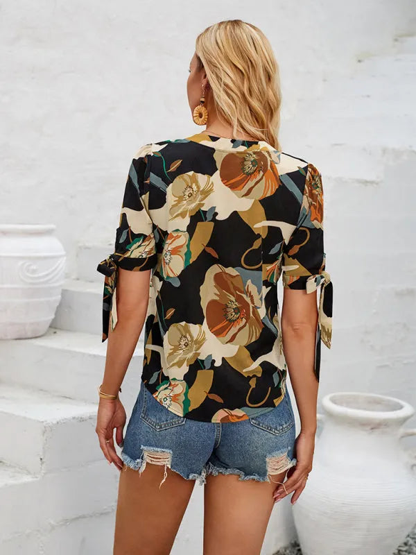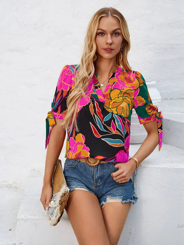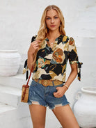 New fashionable printed casual V-neck knotted top