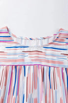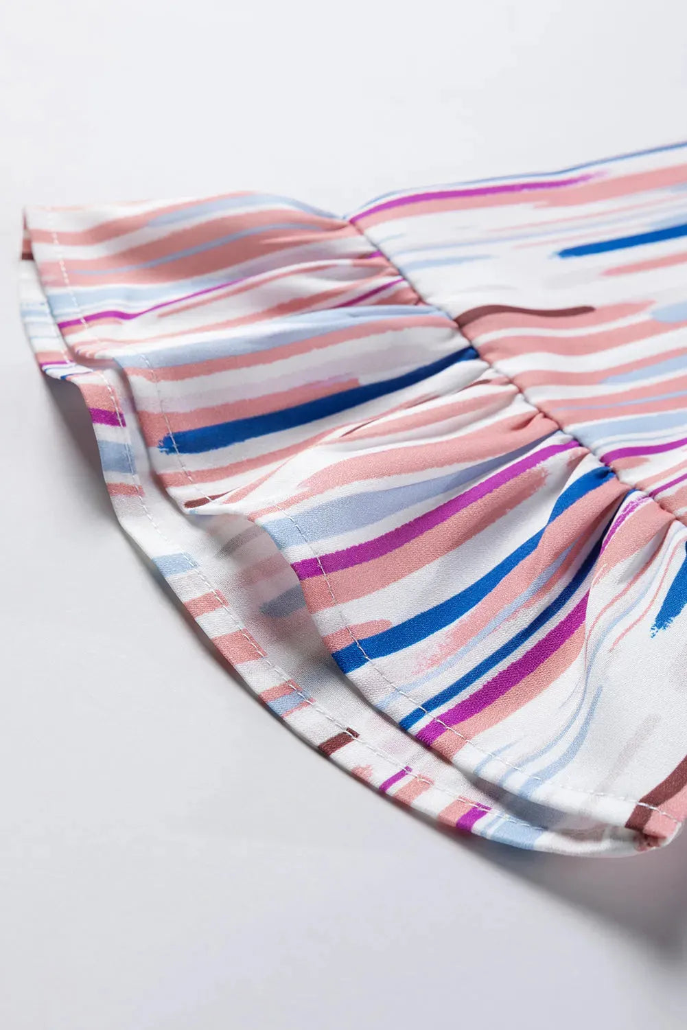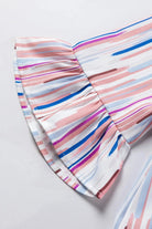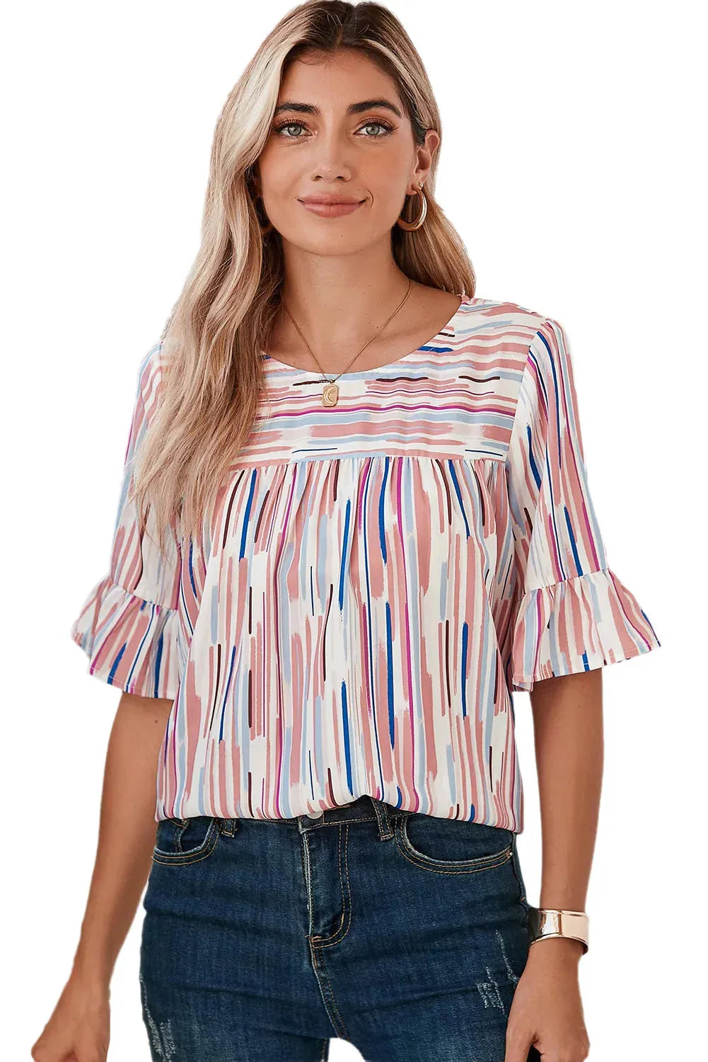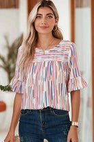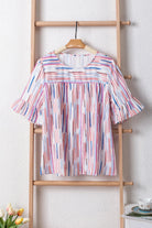 - The blouse showcases a striped pattern, which adds a playful and dynamic element to the overall look. The striped pattern adds visual interest and creates a flattering effect.