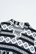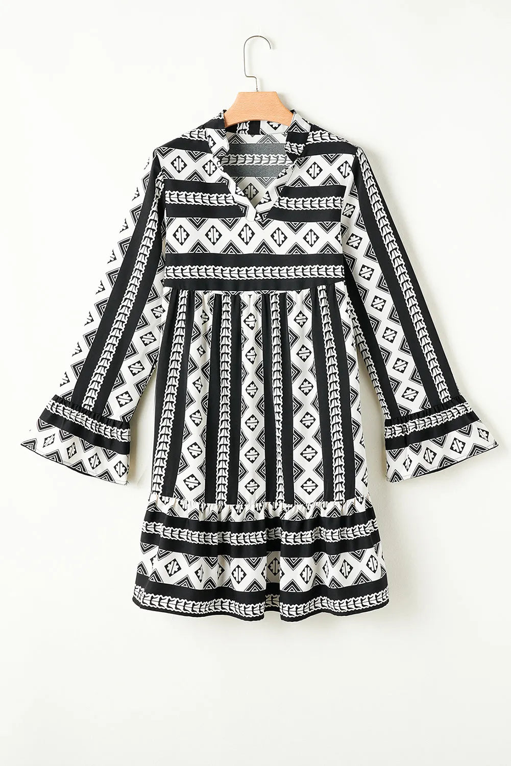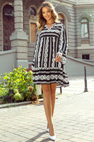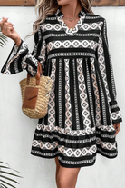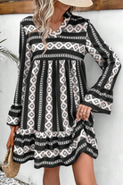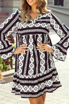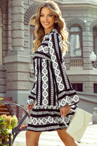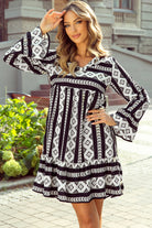 Black Boho Geometric Printed Flared Long Sleeve Mini Dress