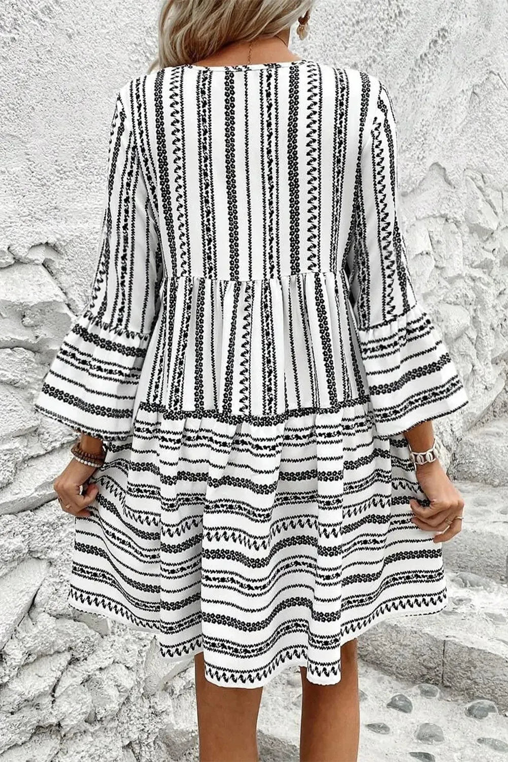 • Embrace the playful vibe of this dress with its charming bell sleeves that effortlessly sway with every movement.