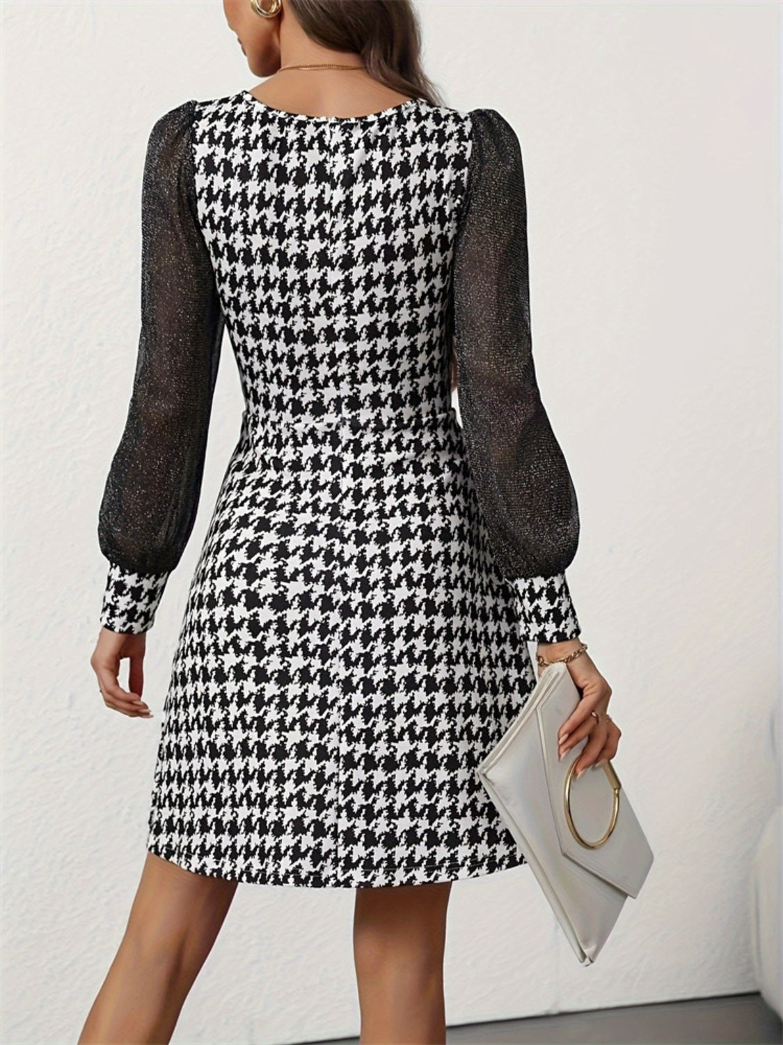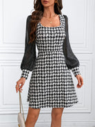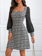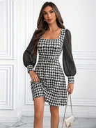 Houndstooth Square Neck Long Sleeve Mini Dress