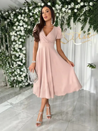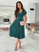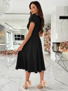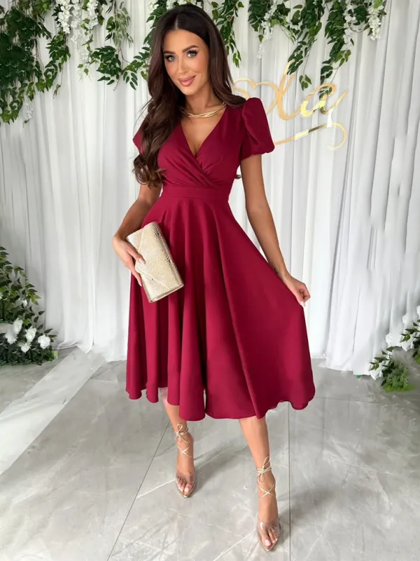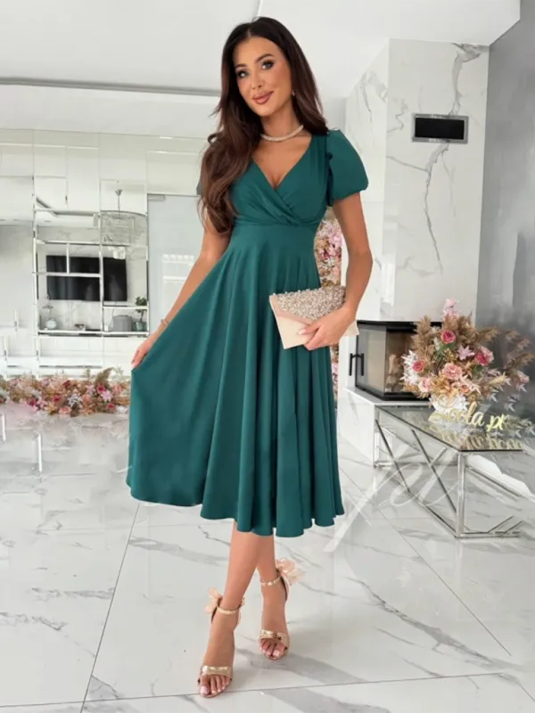 New Commuting Solid Color V-Neck Waist Puff Sleeve Swing Dress