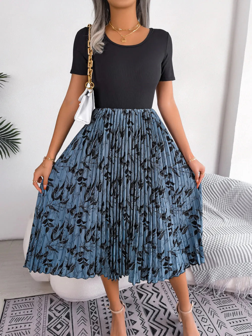 Printed Round Neck Pleated Dress