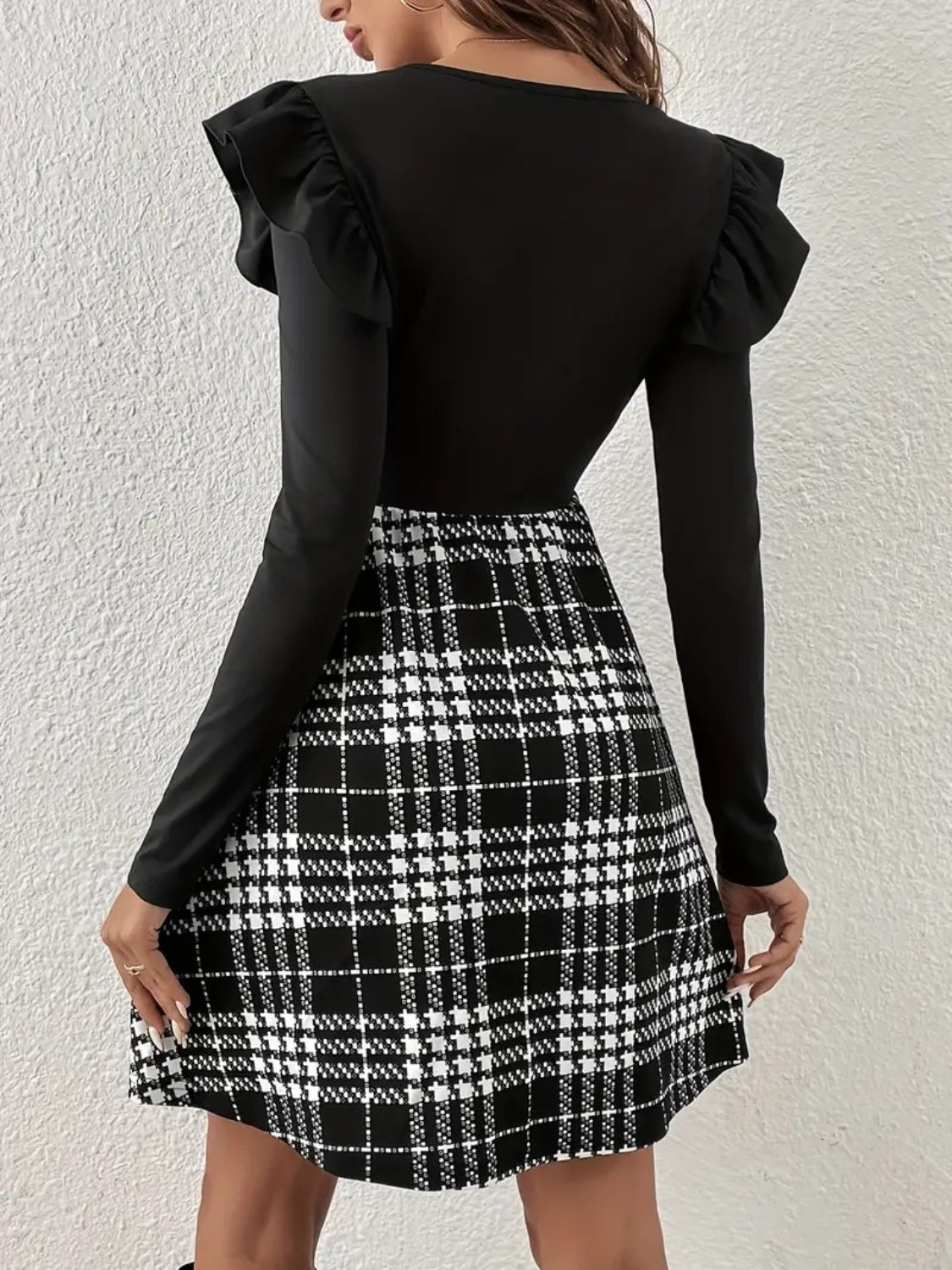 Ruffled Plaid Round Neck Long Sleeve Dress