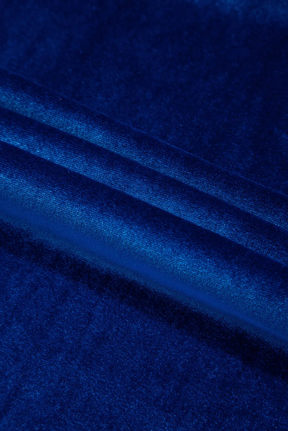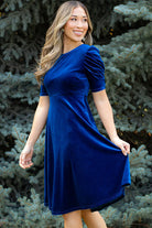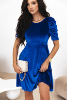Sail Blue Velvet Ruched Short Sleeve Pocketed Mini Dress
