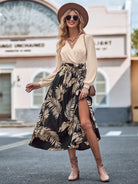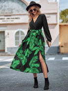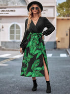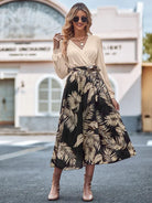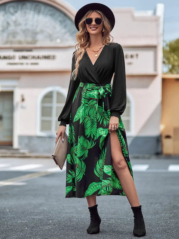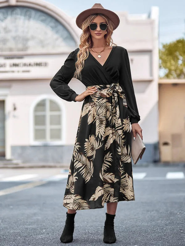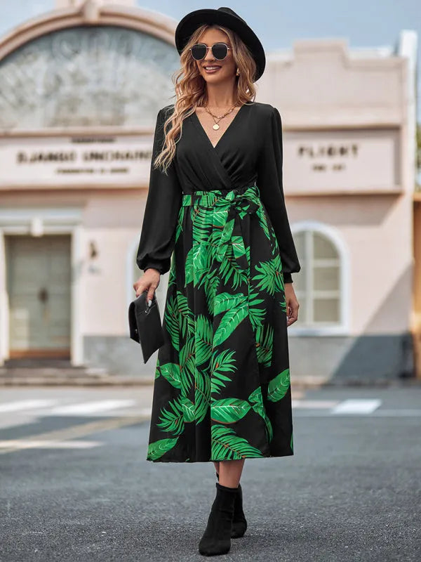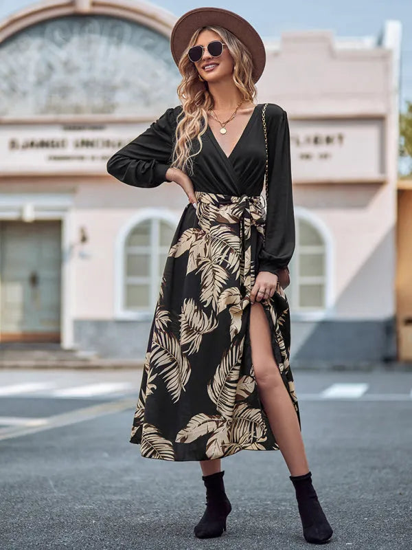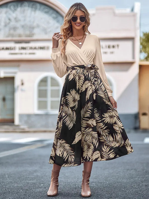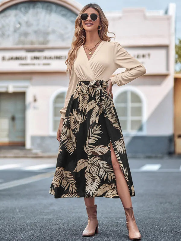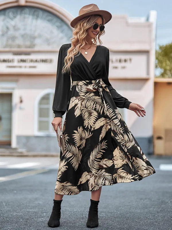 Women's printed patchwork V-neck tied waist long-sleeved dress