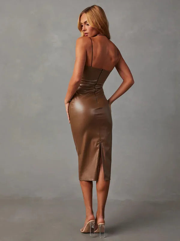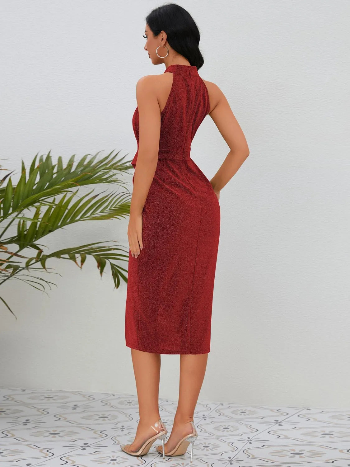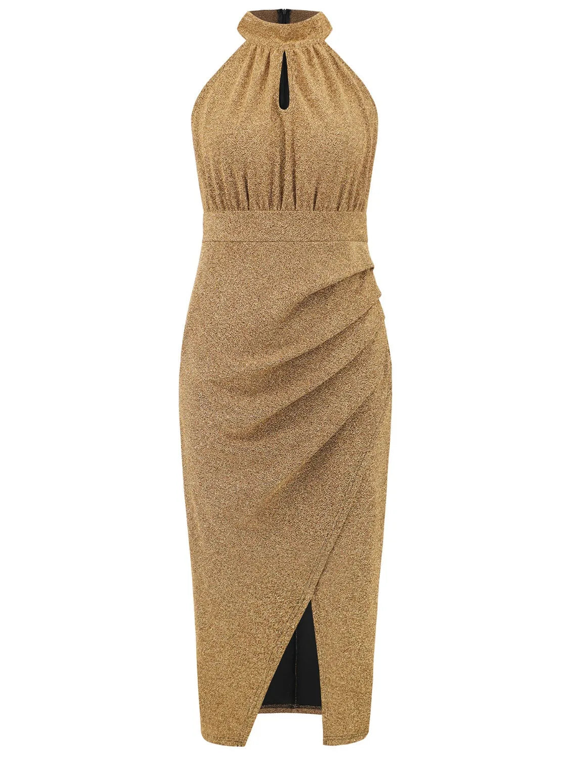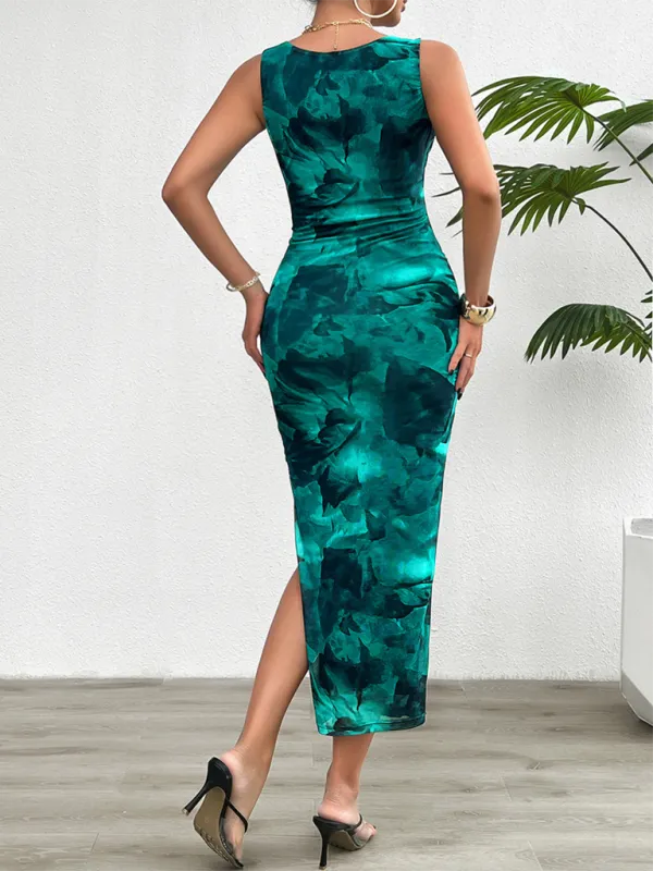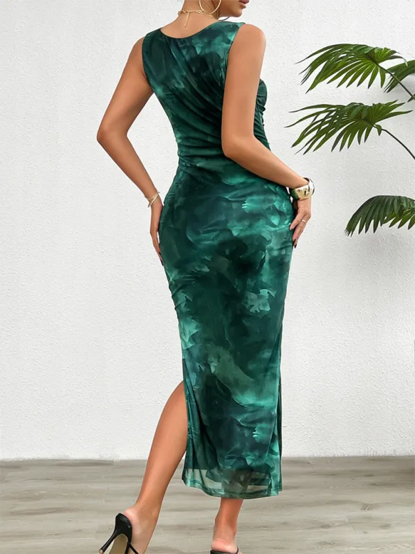 Slit Ruched Mock Neck Sleeveless Dress