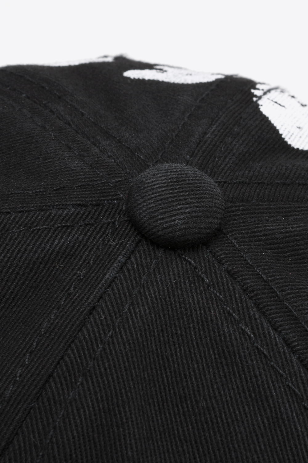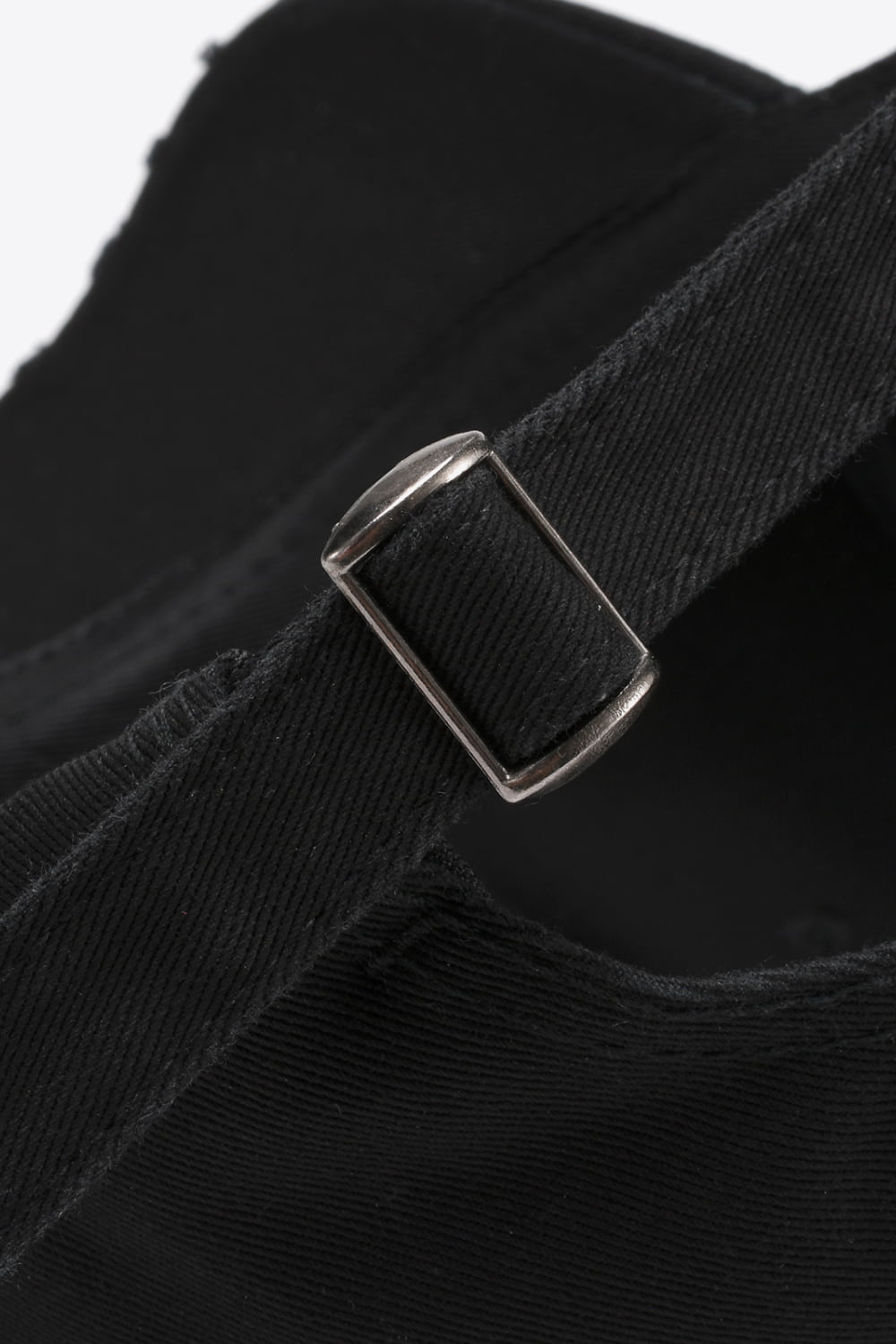 Adjustable cotton baseball hat in black with distressed details, featuring a curved brim for a stylish look.