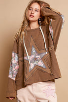 This long sleeve knit top features a round neckline and a relaxed fit, perfect for casual outings. The design includes stylish star-shaped patchwork, combining French terry fabric with floral printed knit for a unique contrast. The frayed edges throughout the garment add an effortlessly chic touch, making it a standout piece that blends comfort with a trendy aesthetic. Ideal for layering or wearing on its own, this top is both fashionable and cozy.