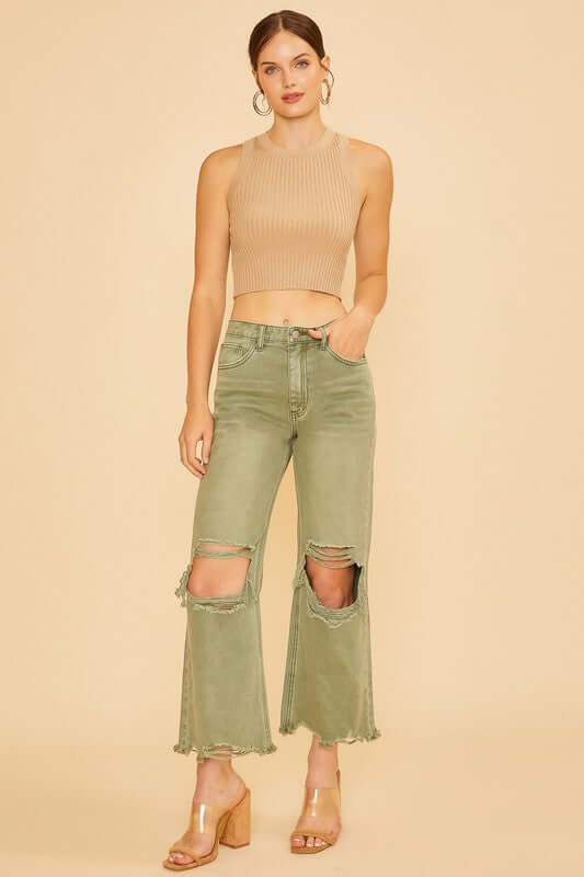 Distressed raw hem jeans are a trendy and edgy choice for a casual, street-style look. The distressed detailing gives the jeans a worn-in, vintage vibe, adding a cool and laid-back element to your outfit. The raw hem, with its unfinished and frayed edges, adds a touch of ruggedness and adds interest to the bottom of the jeans. These jeans can be styled in various ways - paired with a simple t-shirt and sneakers for a casual everyday look, or dressed up with a blouse and heels for a more fashion-forward ensemble. The distressed raw hem jeans are a versatile piece that can add a modern and stylish edge to your wardrobe.