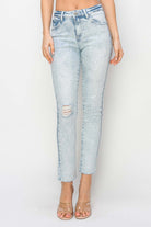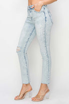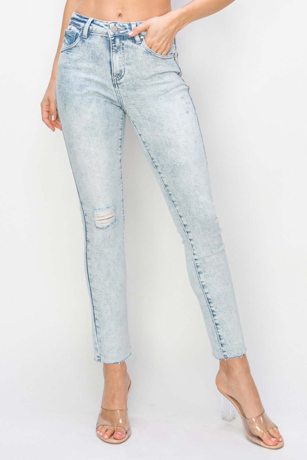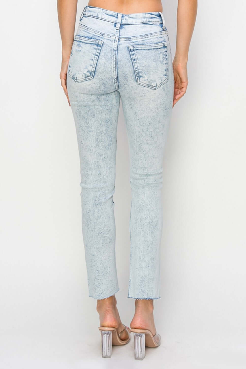 These high rise distressed skinny jeans feature a figure-flattering silhouette and on-trend distressed details. The high rise design adds a modern touch to the classic skinny fit. The distressed areas give these jeans a cool, laid-back vibe perfect for casual outfits. With a versatile style, they can be dressed up or down for various occasions. Made for comfort and style, these jeans are a wardrobe staple for a chic and effortless look. Whether paired with sneakers for a casual day out or heels for a night out, these jeans offer endless styling possibilities.