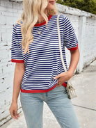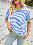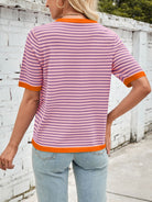 Lovelet Striped Contrast Round Neck Half Sleeve Knit Top