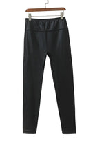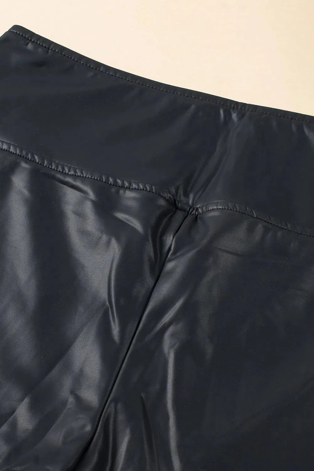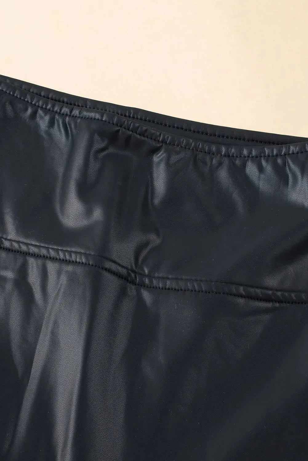 - Crafted from sleek leather, these leggings exude elegance, creating a fashionable and bold statement in your wardrobe.