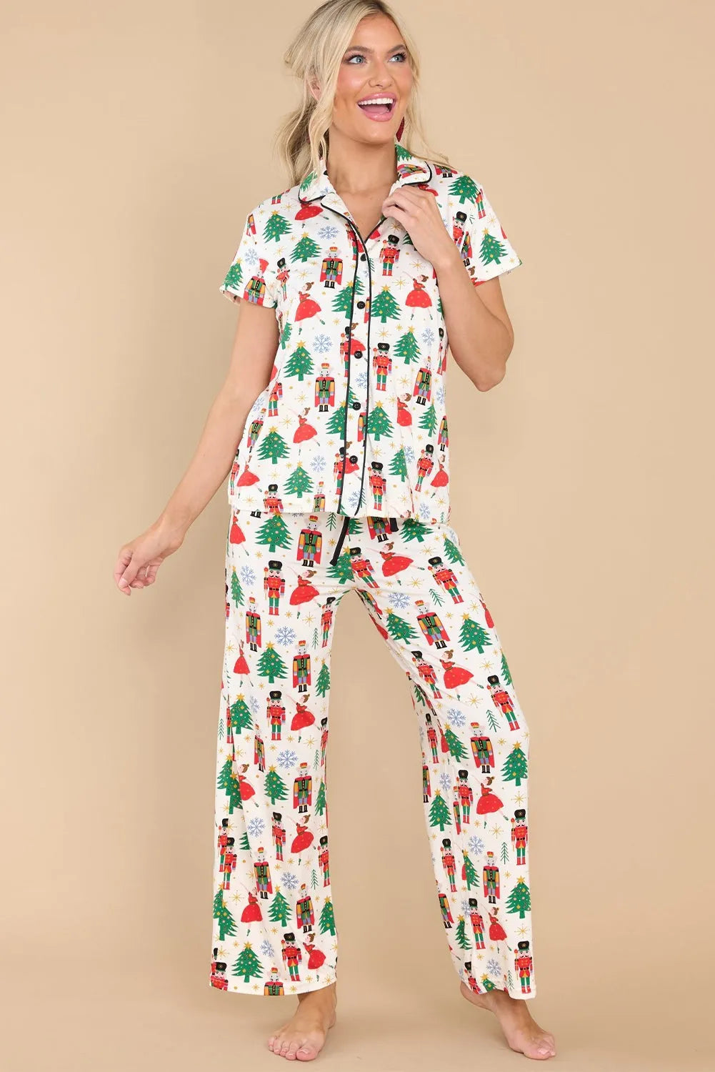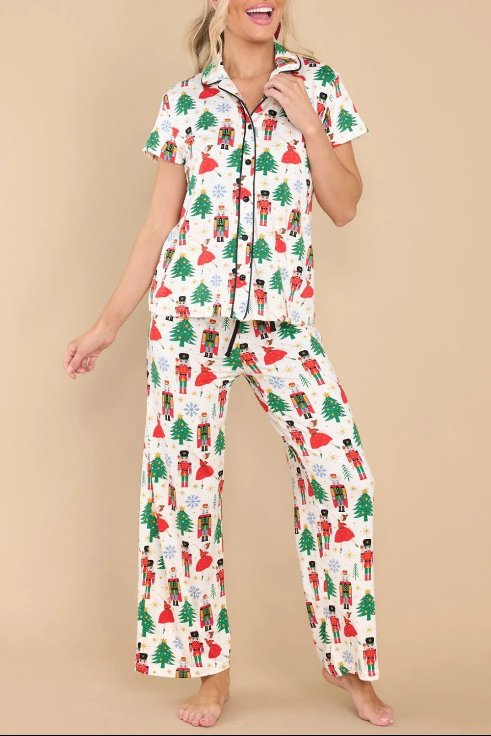 - The Christmas tree and nutcracker print adds a playful and joyful touch to the pajama set.