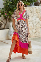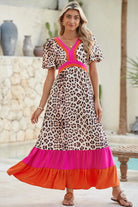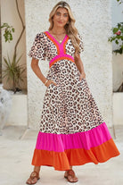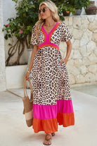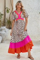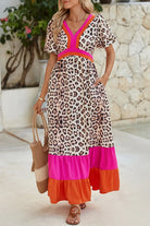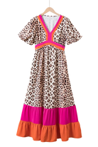 Bright Pink V-neck Leopard Print Colorblock Maxi Dress