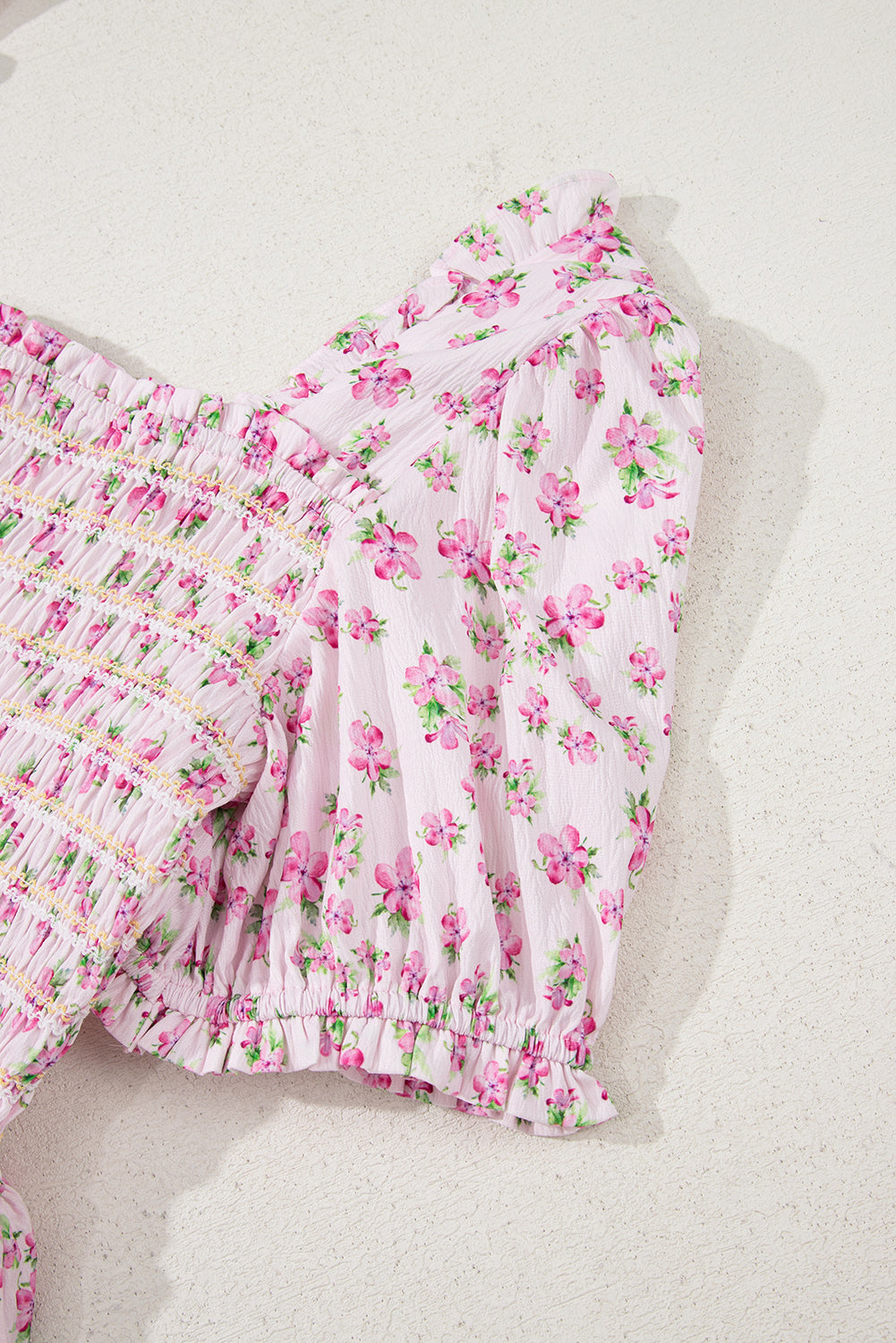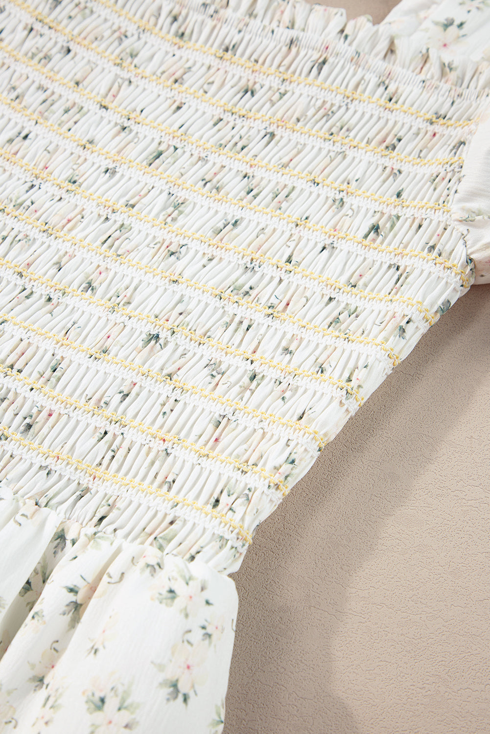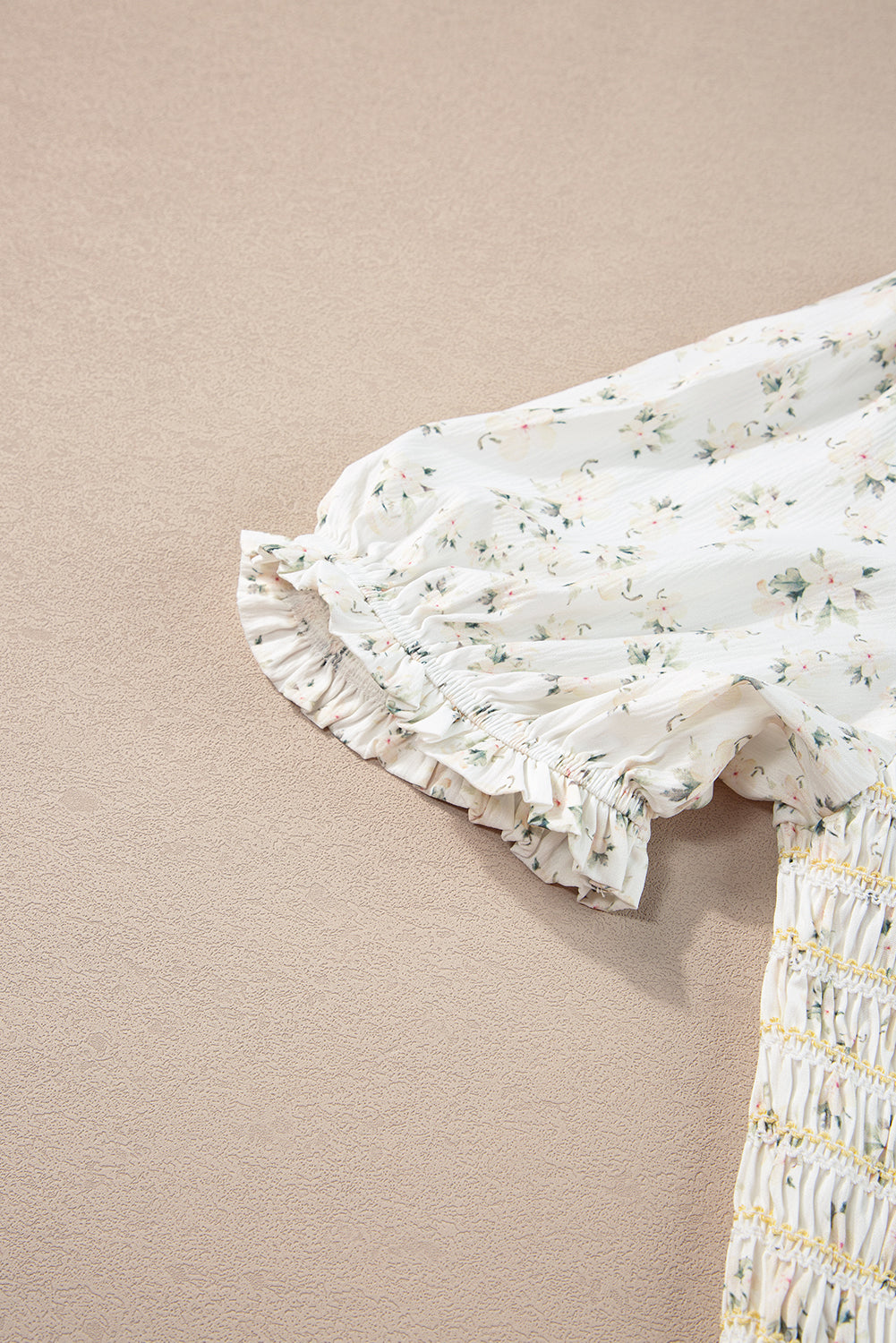 White Frill Neckline Shirred Bodice Floral Maxi Dress