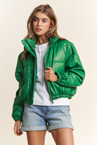 Stay warm and stylish with our faux leather turtle neck cropped puffer jacket. It has both a zipper closure as well as snap buttons. There is also a drawstring on the inside if the bottom hem. Its lined on the inside so you're sure to stay protected from the fall and winter weather.