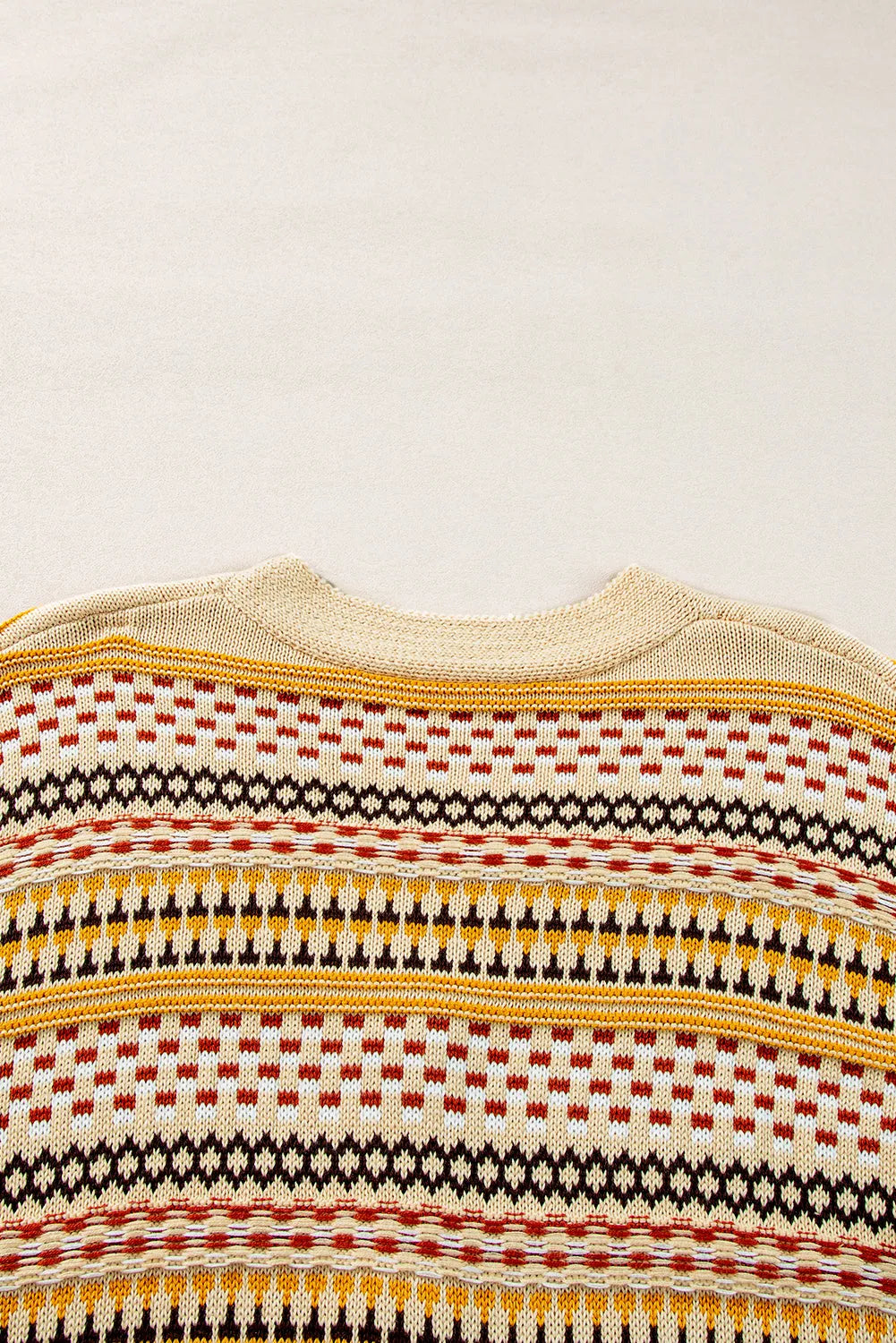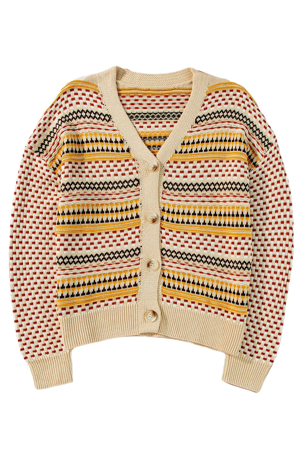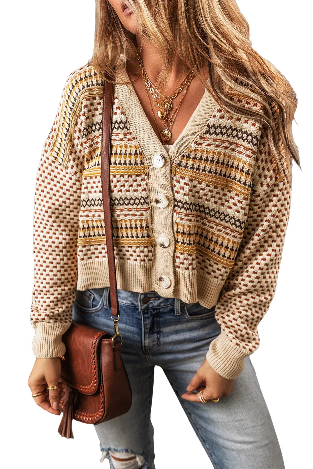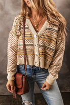 Khaki Geometric Pattern Button Front V Neck Cropped Cardigan