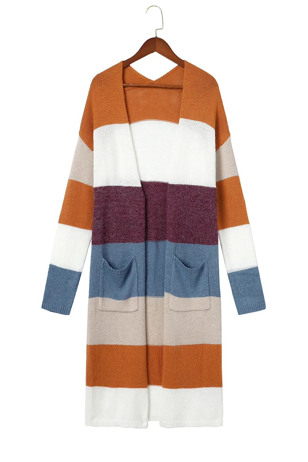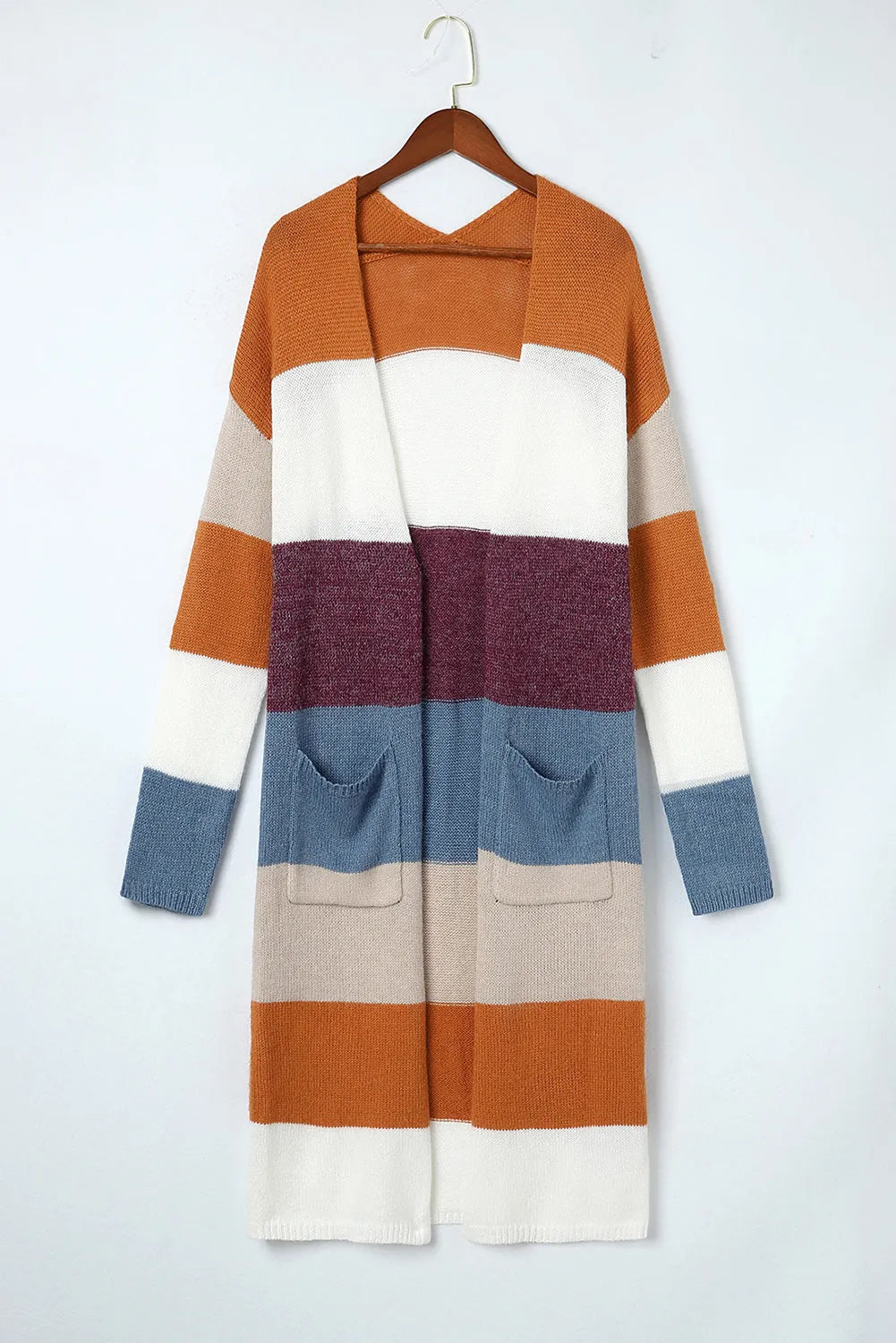 Multicolor Knitted Color Block Open Front Long Cardigan