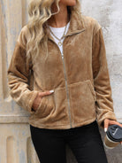 Perfee Pocketed Zip Up Collared Neck Long Sleeve Jacket