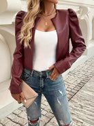 PU Leather Open Front Puff Sleeve Jacket
