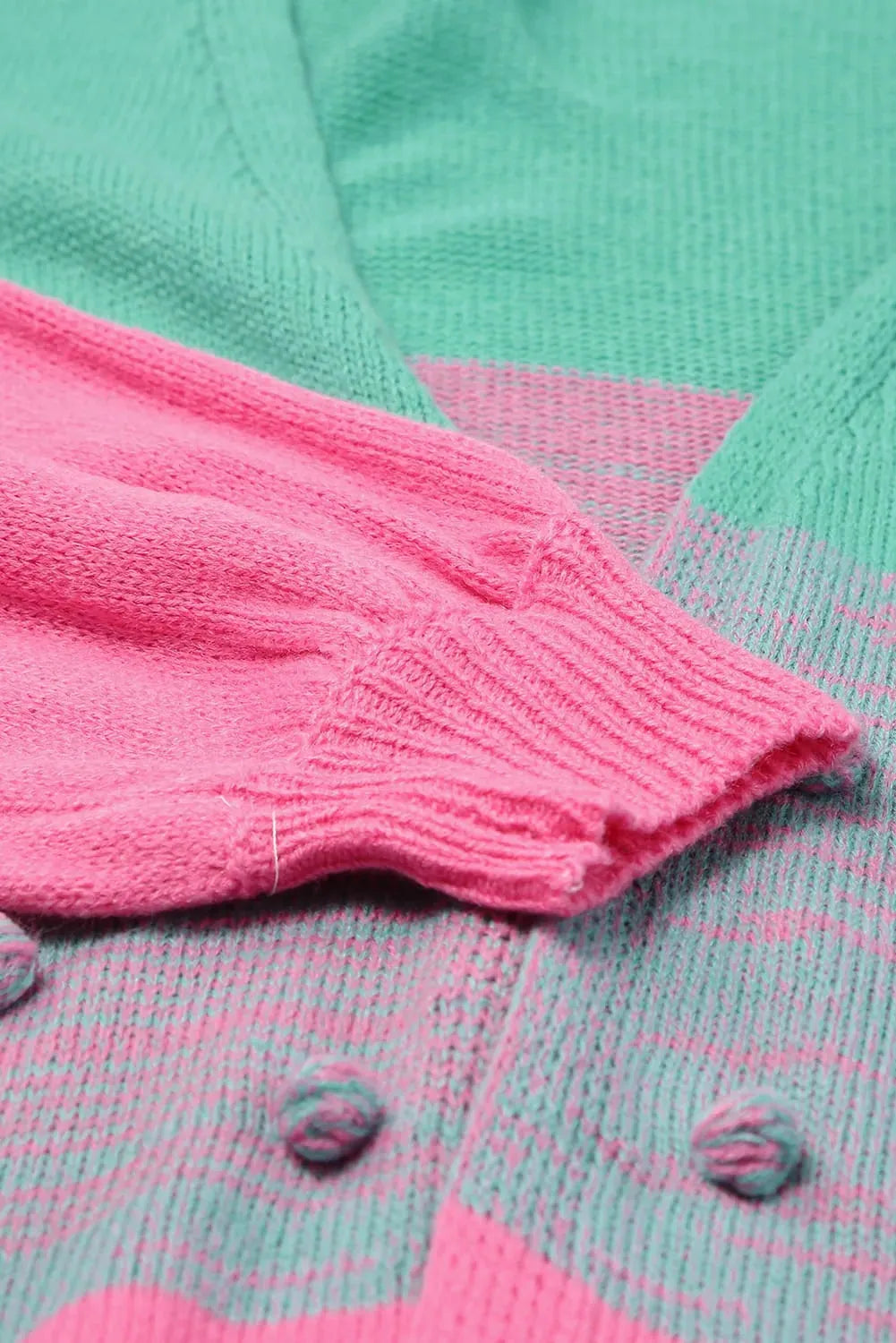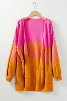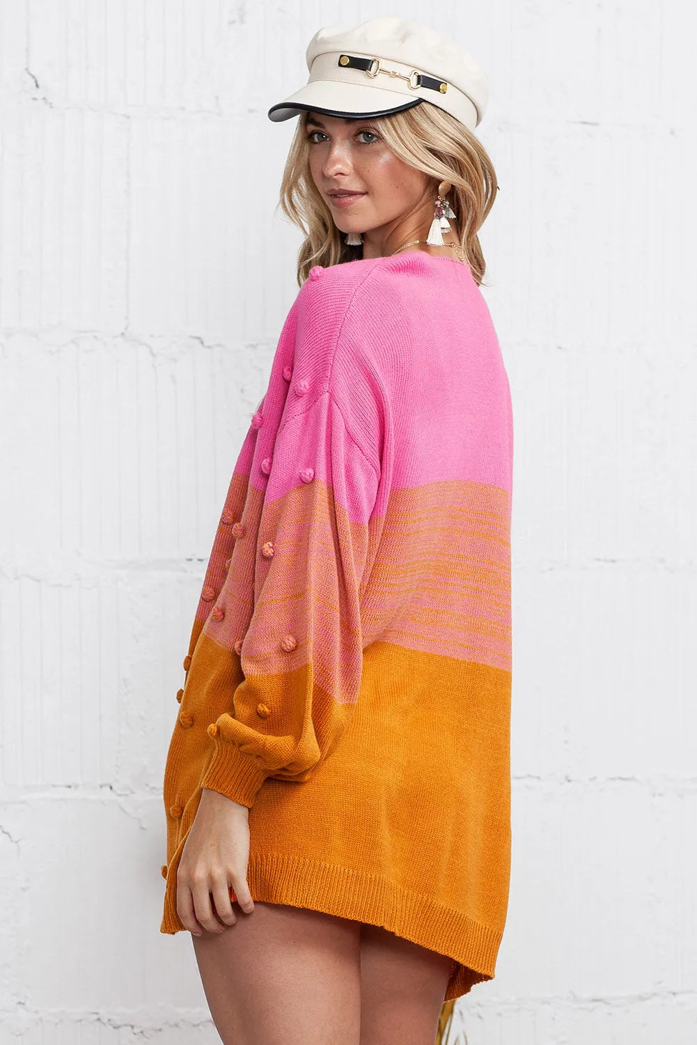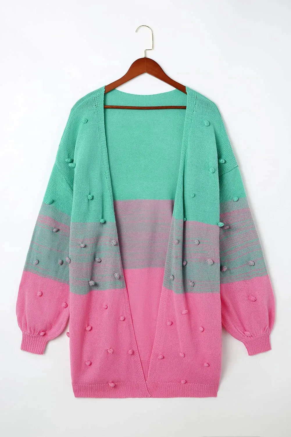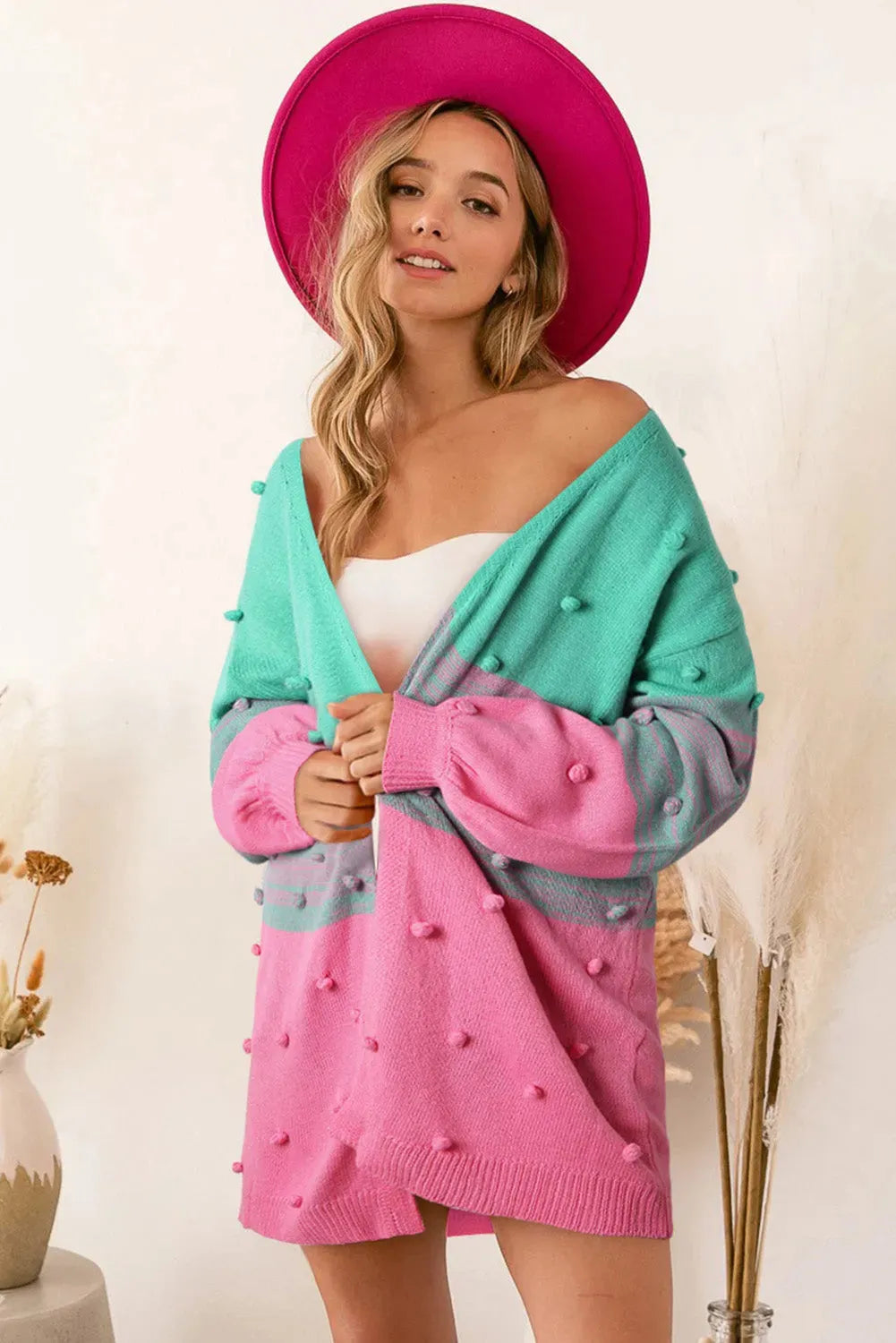 - The Rose Pompom Color Block Knit Open Front Cardigan is a charming and cozy piece that combines a soft rose color with playful pompom details and a color block design, creating a delightful and eye-catching look.