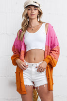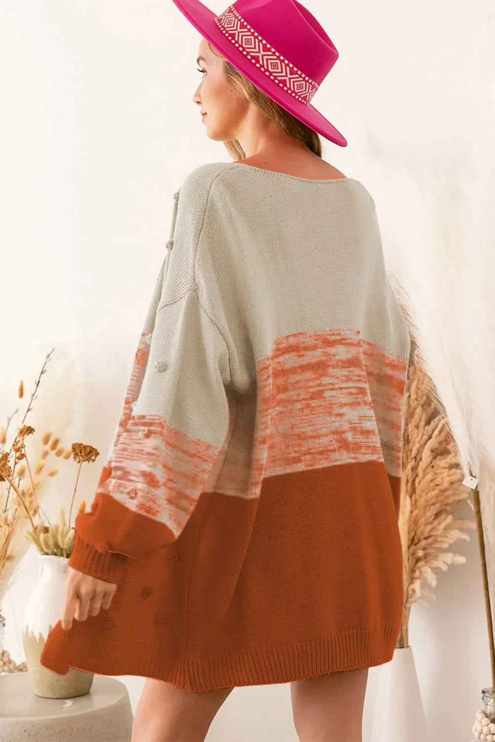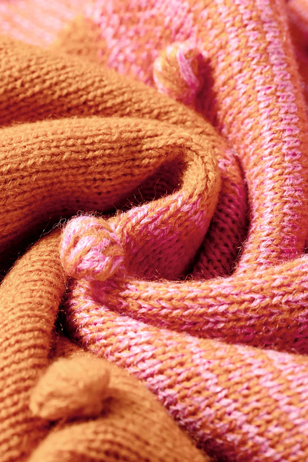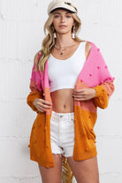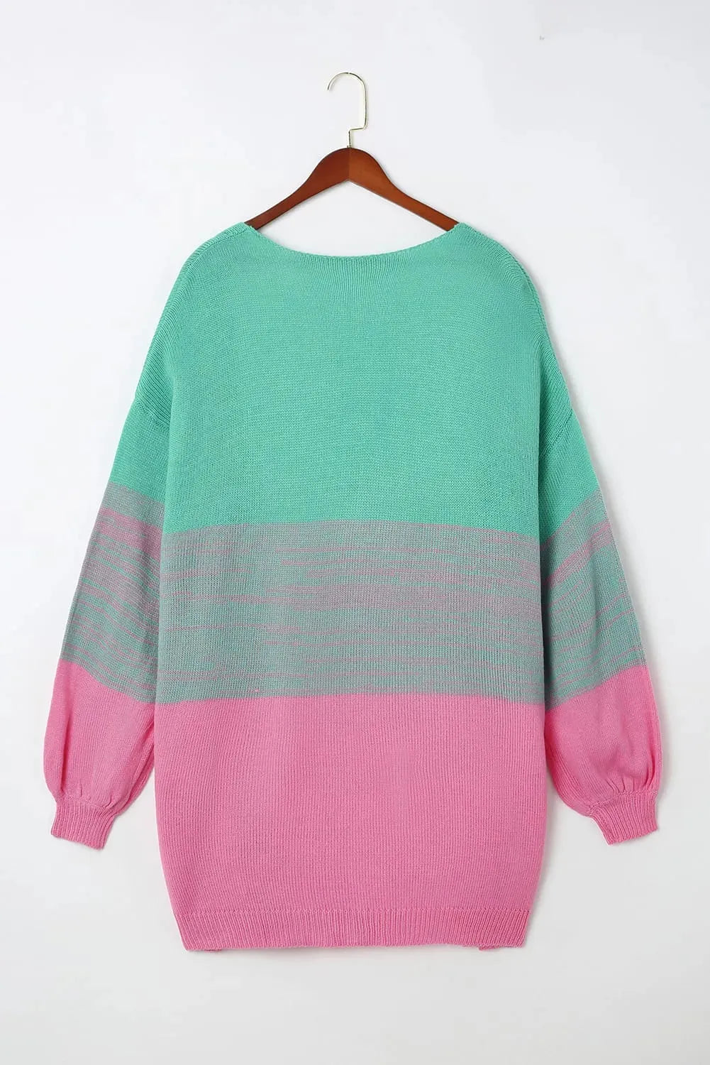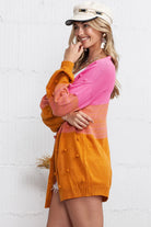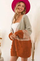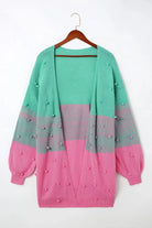- The Rose Pompom Color Block Knit Open Front Cardigan is a charming and cozy piece that combines a soft rose color with playful pompom details and a color block design, creating a delightful and eye-catching look.