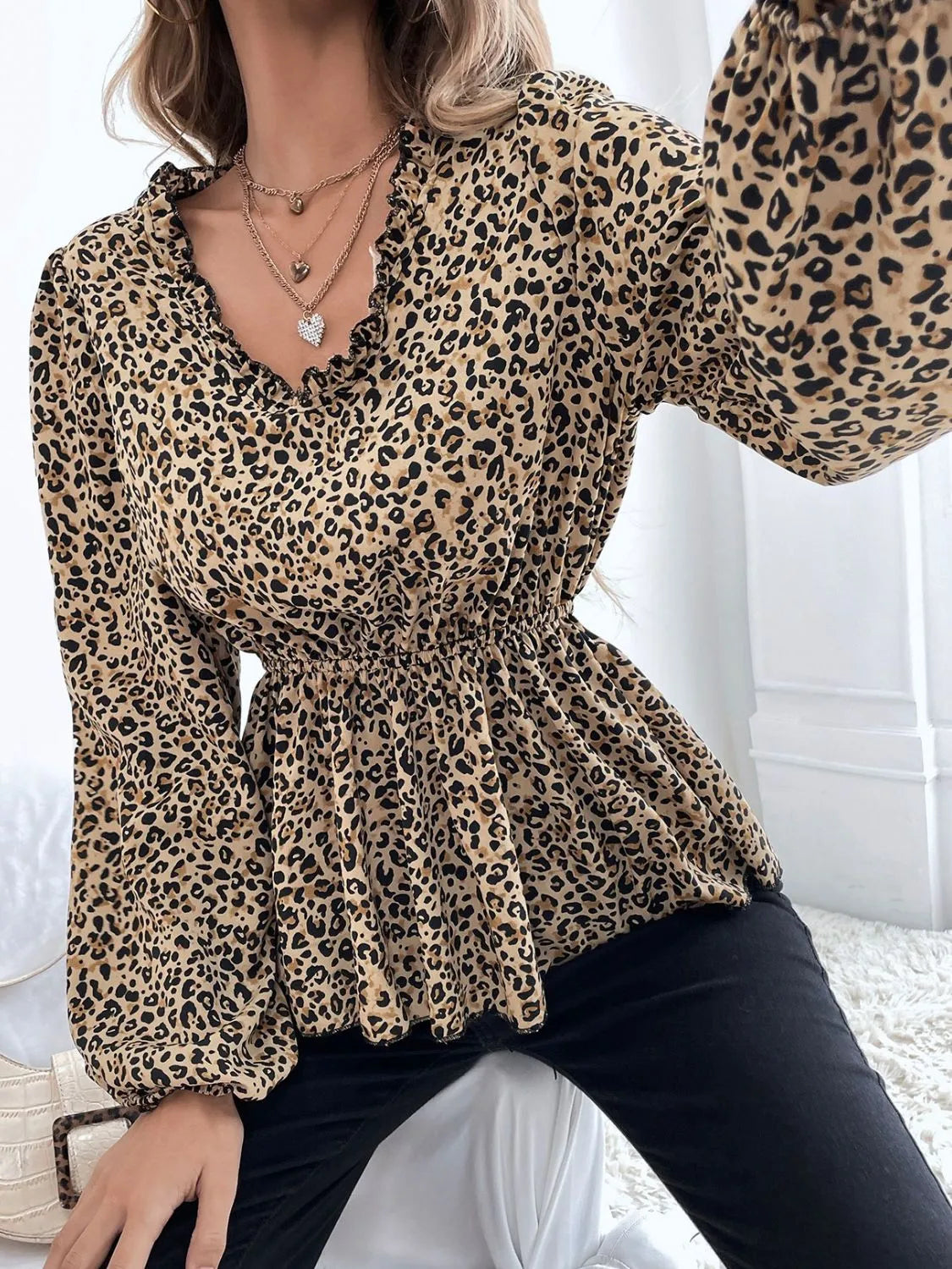 Frill Peplum Leopard V-Neck Long Sleeve Blouse