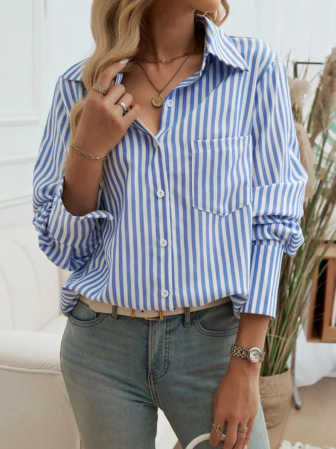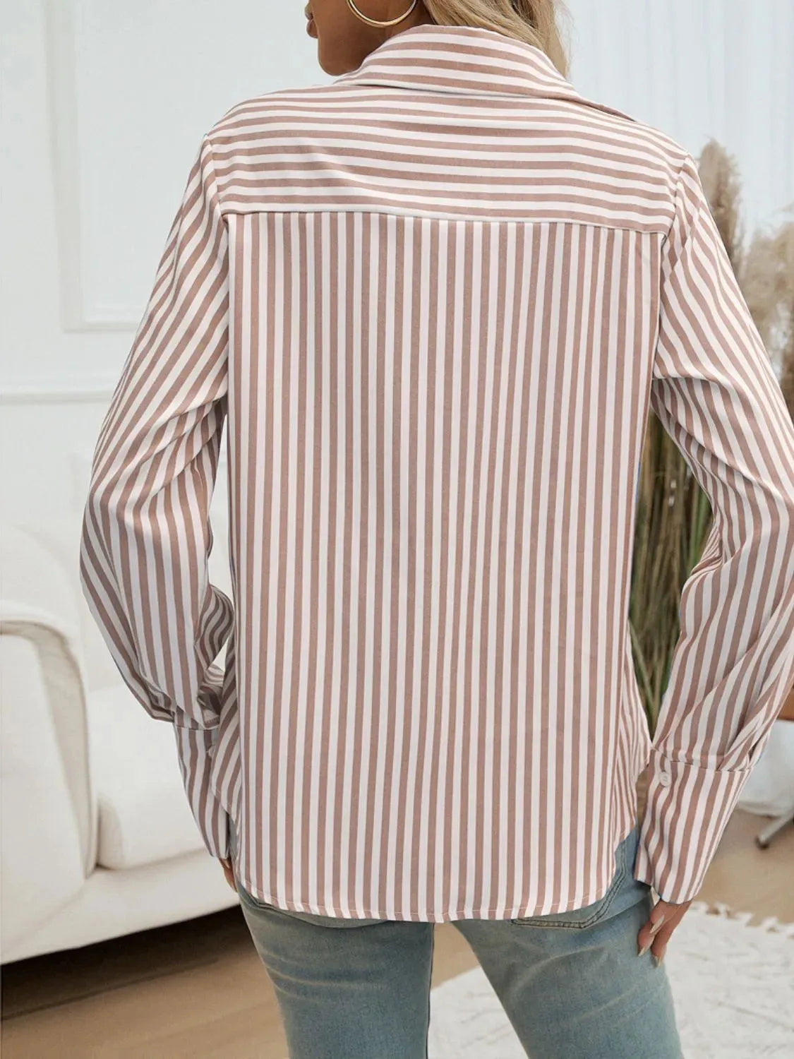Pocketed Striped Collared Neck Long Sleeve Shirt