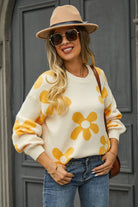 Angel Wings Floral Print Round Neck Dropped Shoulder Pullover Sweater