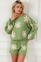 Flower Pattern Long Sleeve Sweater and Drawstring Shorts Set