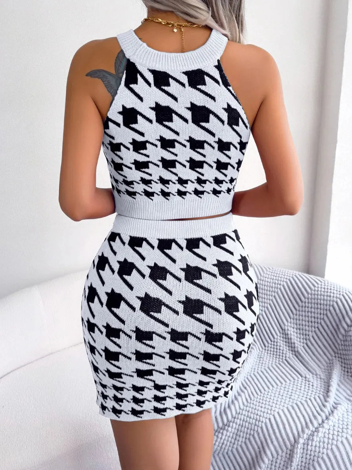 Houndstooth Sleeveless Top and Skirt Sweater Set