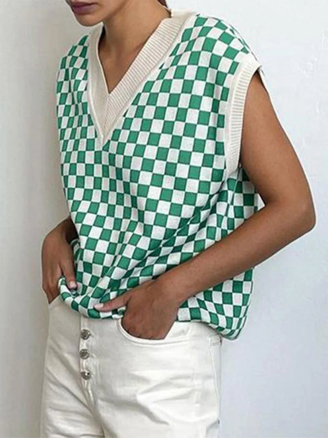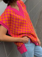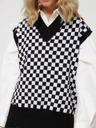 Full Size Checkered V-Neck Cap Sleeve Sweater