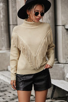 Turtle Neck Tassel Front Long Sleeve Pullover Sweater