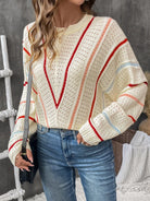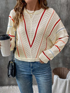 Perfee Eyelet Round Neck Long Sleeve Sweater