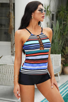 Experience the ultimate beach style with our Striped Cutout Swim Top. This top features a unique cutout design and vibrant multicolored stripes, perfect for making a statement by the water.