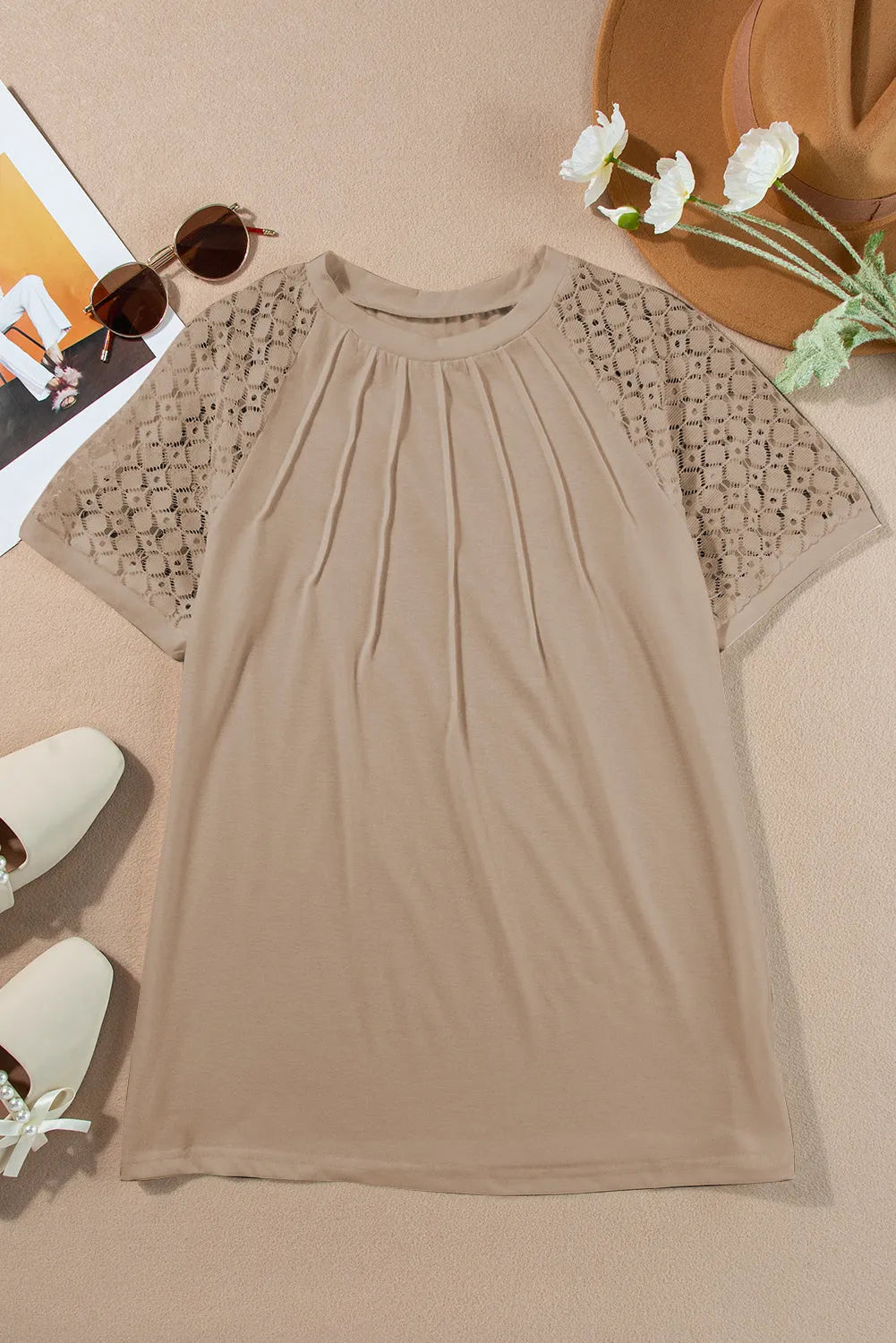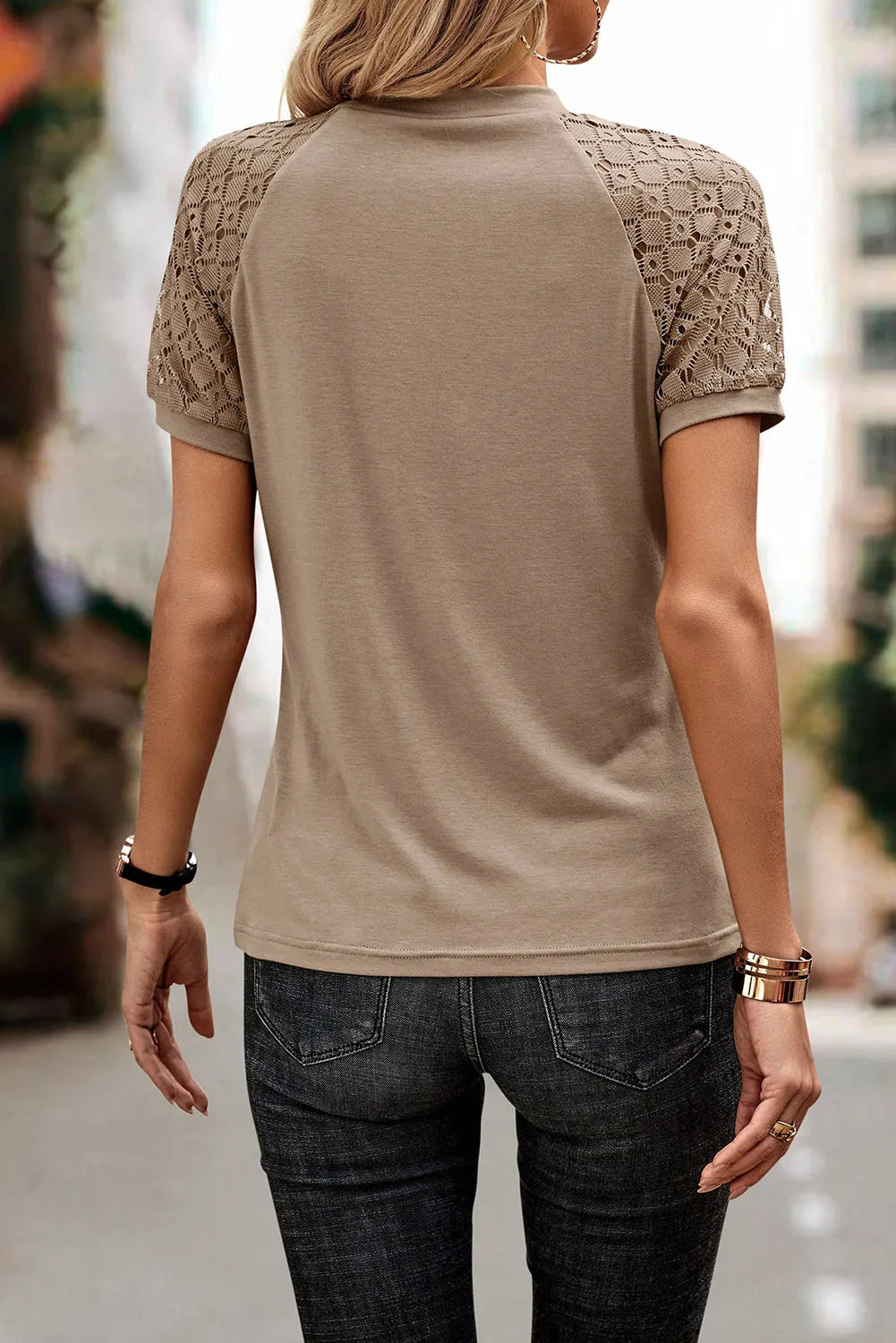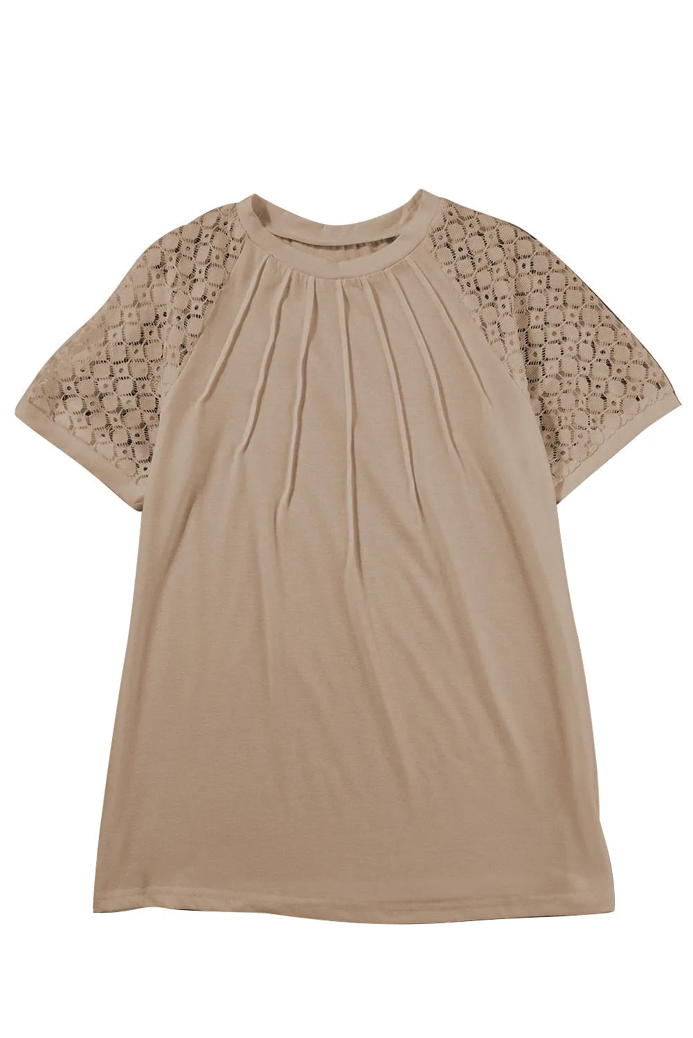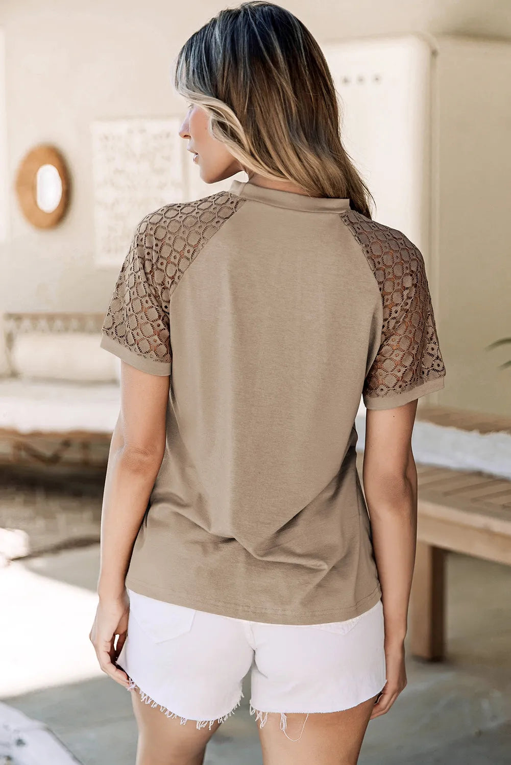 Pale Khaki Seamed Detail Contrast Lace Raglan Sleeve Tee