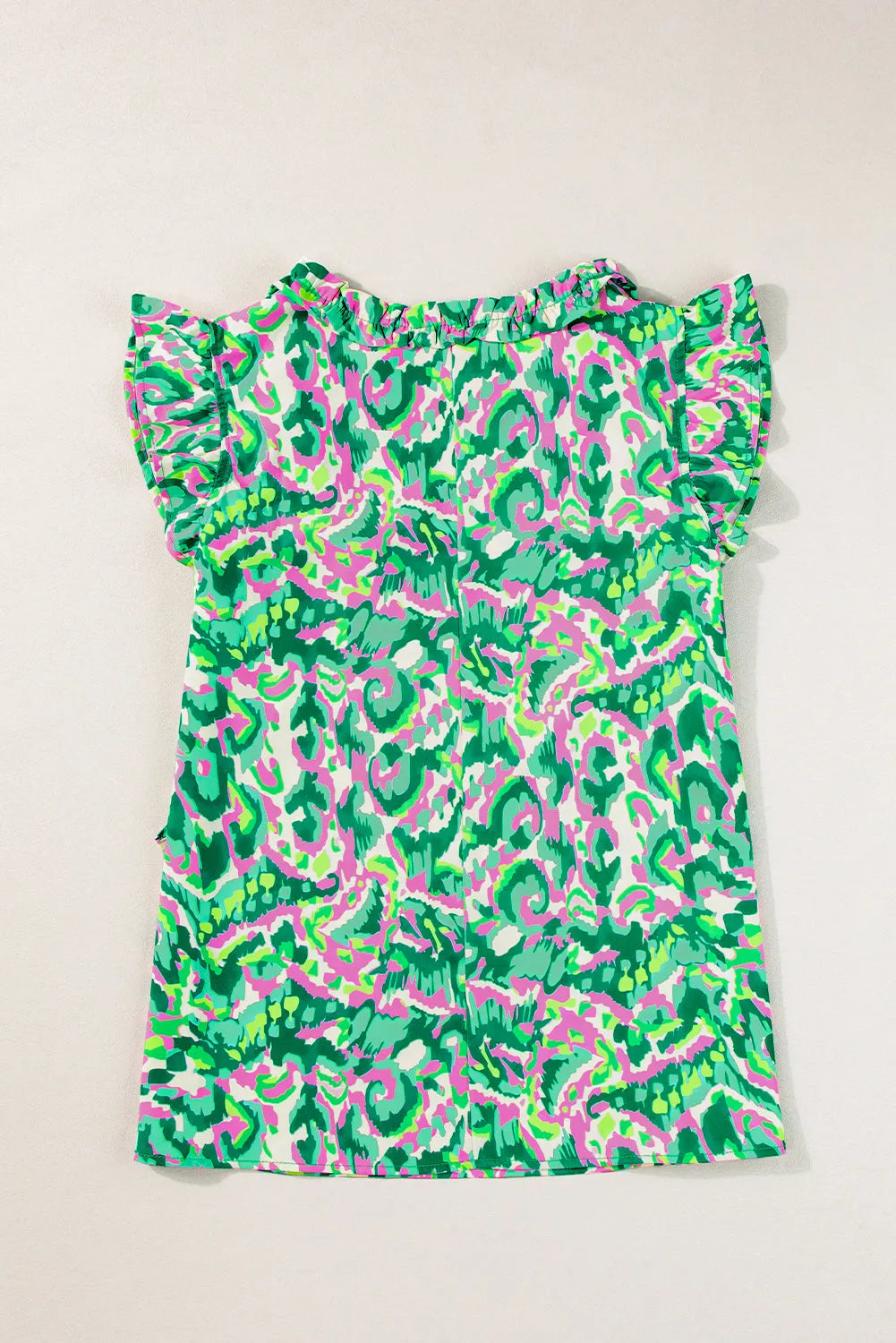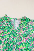 Green Abstract Print Ruffled Trim Tied Split Neck Tank Top