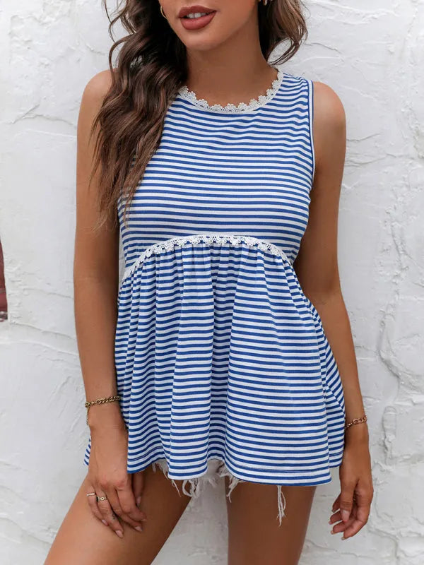 Ladies Lace Panel Crew Neck Striped Knit Tank Top
