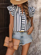 Contrast Striped Notched Ruffled Cap Sleeve Blouse