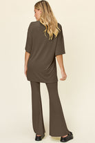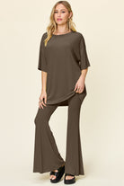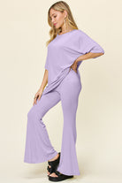 Double Take Full Size Round Neck Drop Shoulder T-Shirt and Flare Pants Set