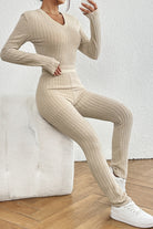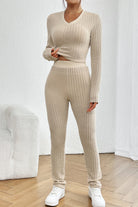 Ribbed V-Neck Long Sleeve Cropped Top and Pants Set