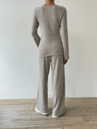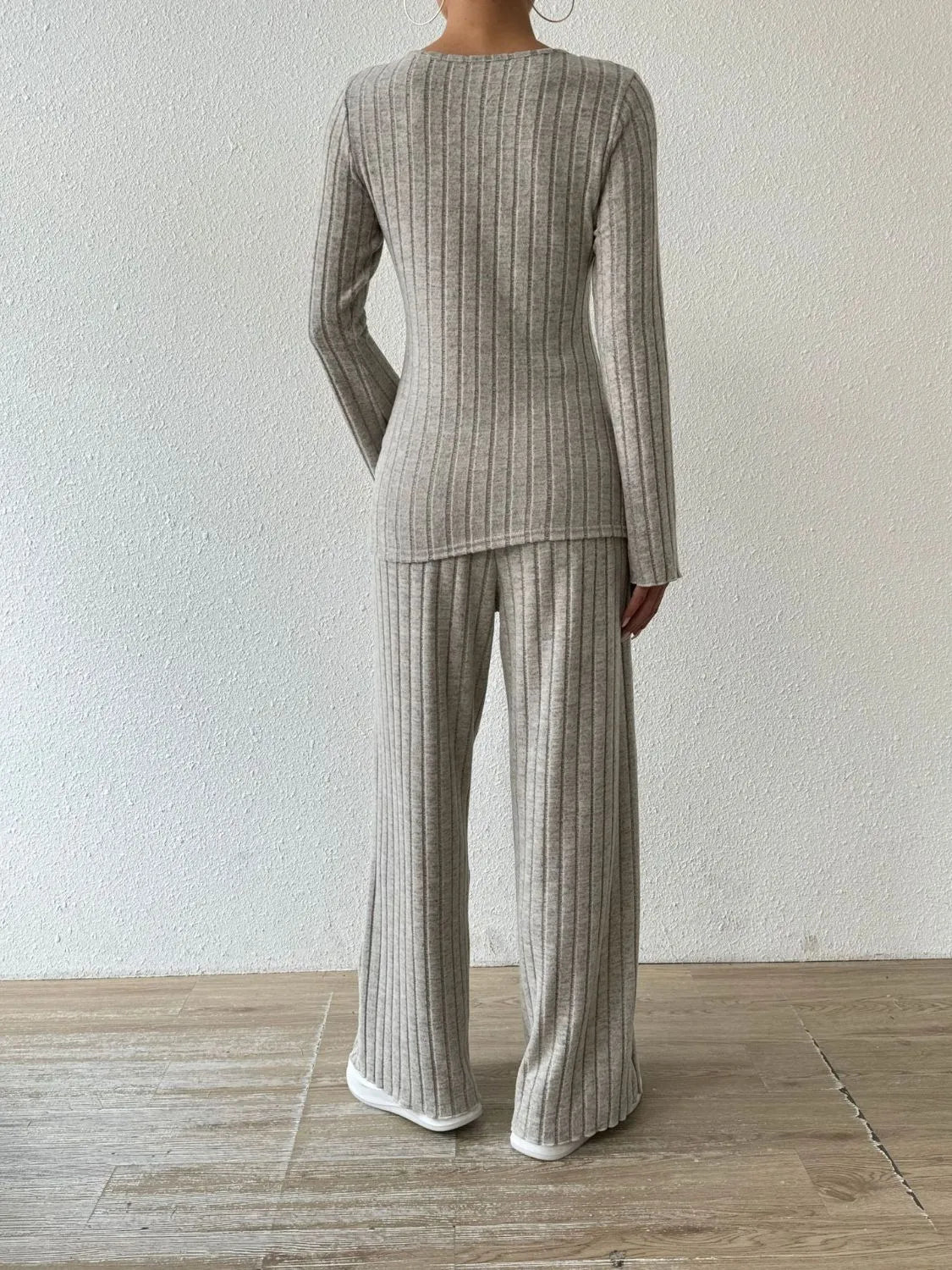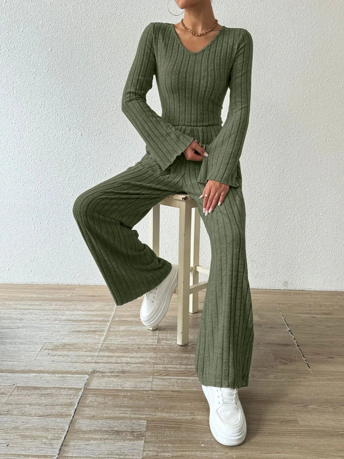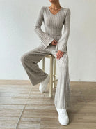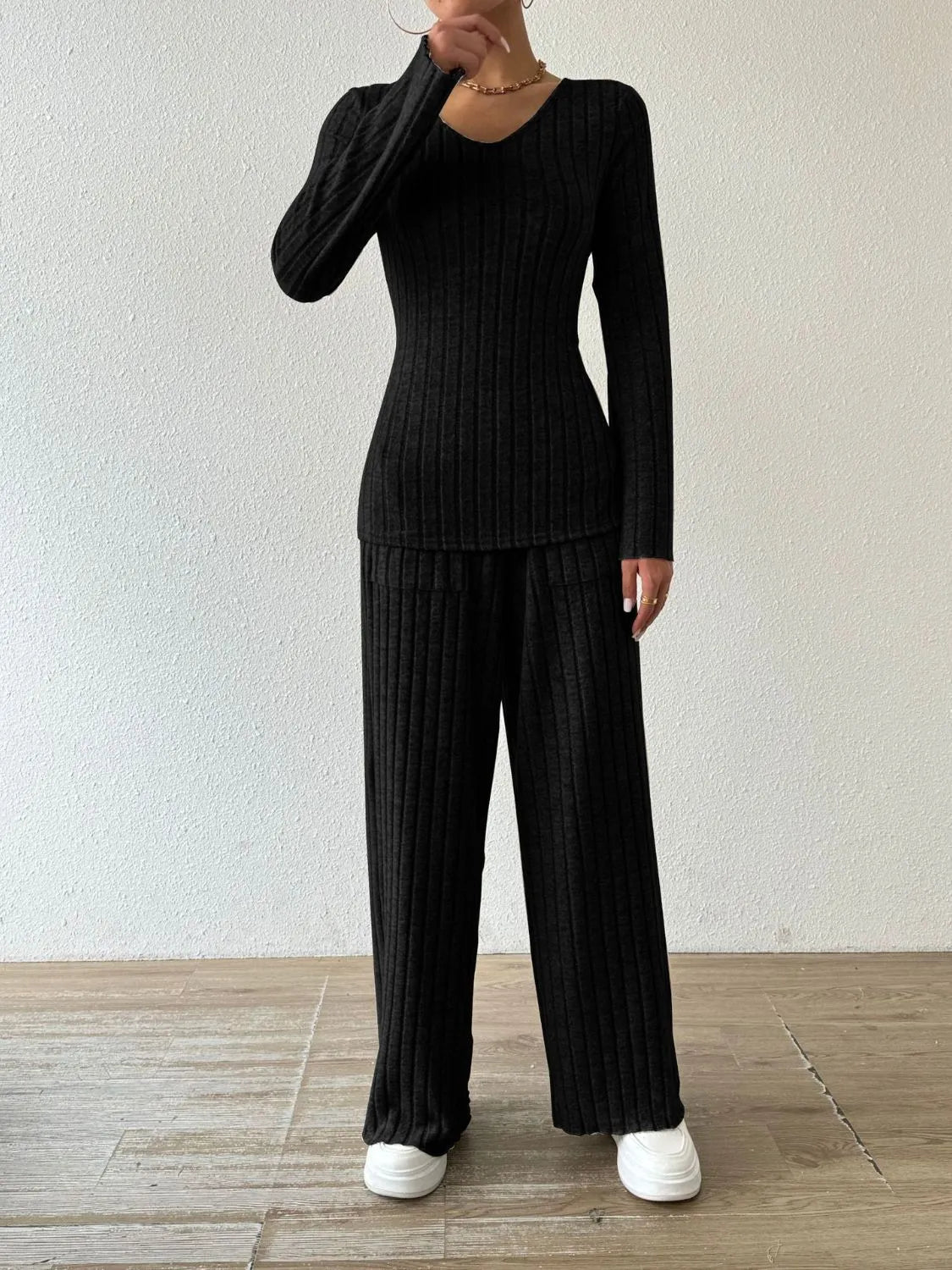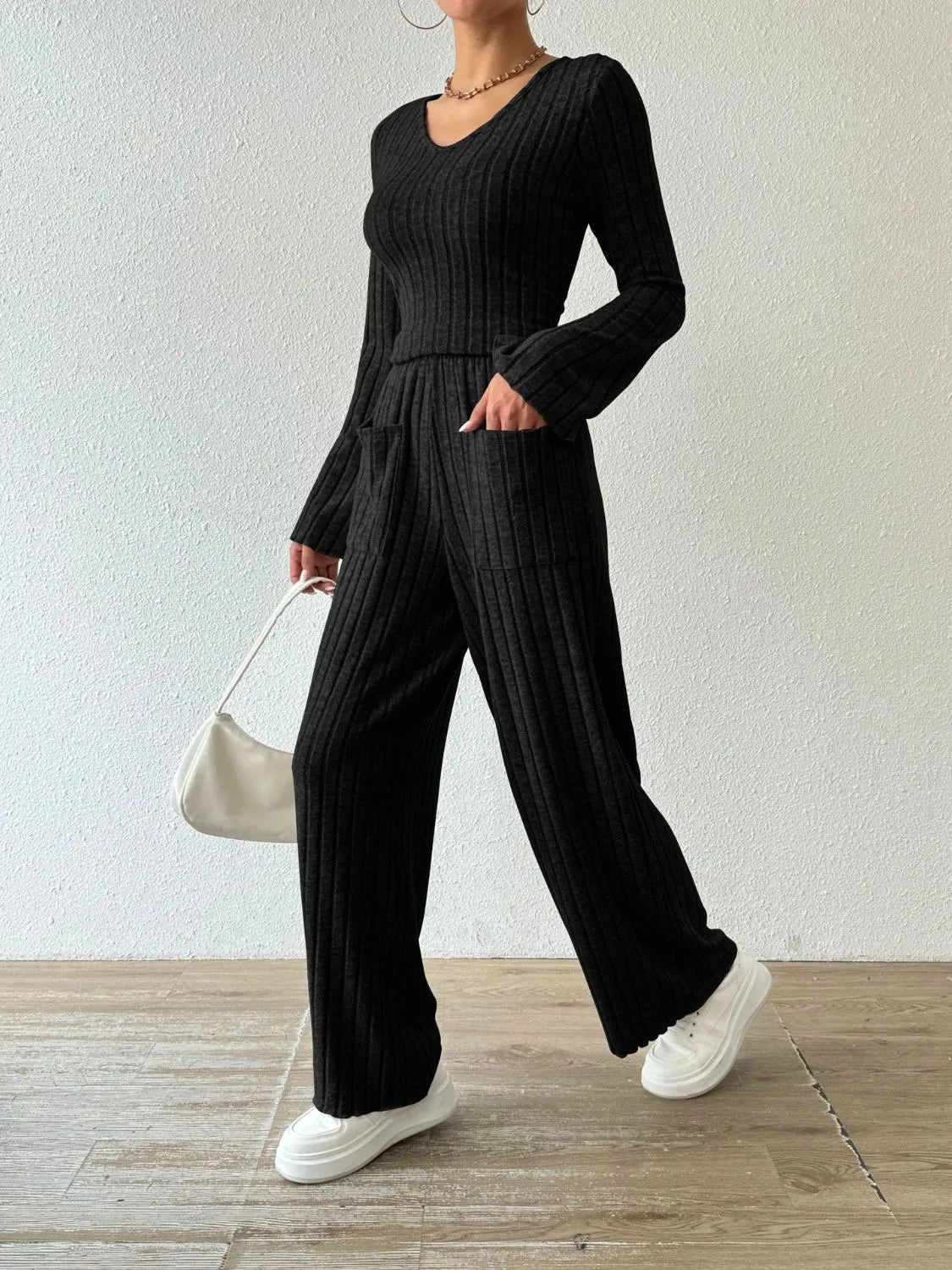 Ribbed V-Neck Long Sleeve Top and Pocketed Pants Set
