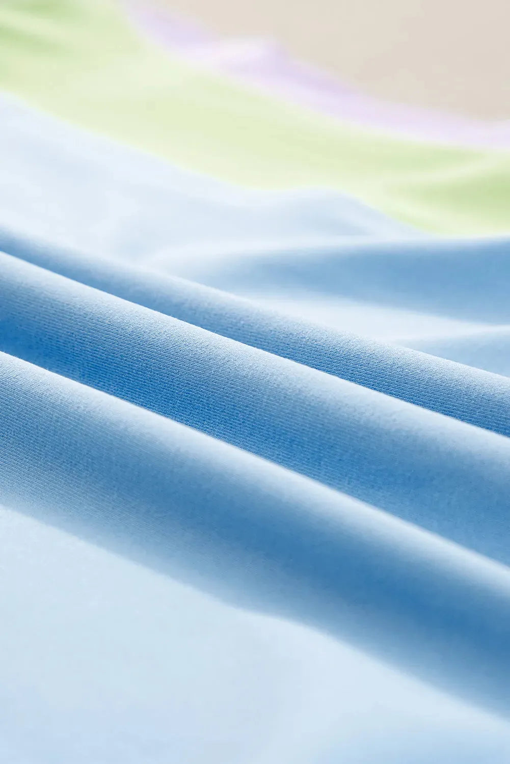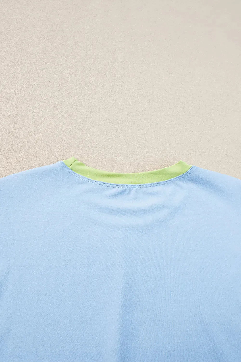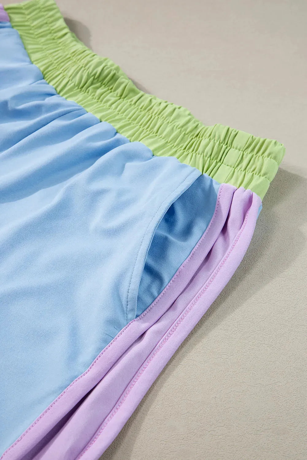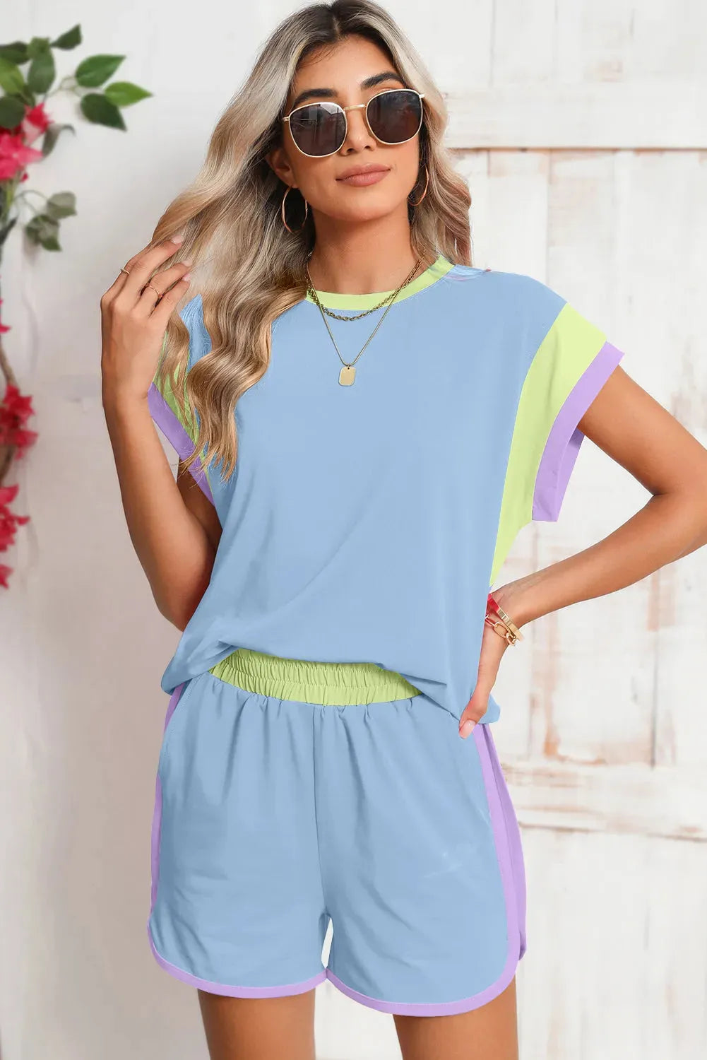 Blue Color Block Loose Fit Top and Elastic Waist Shorts Set