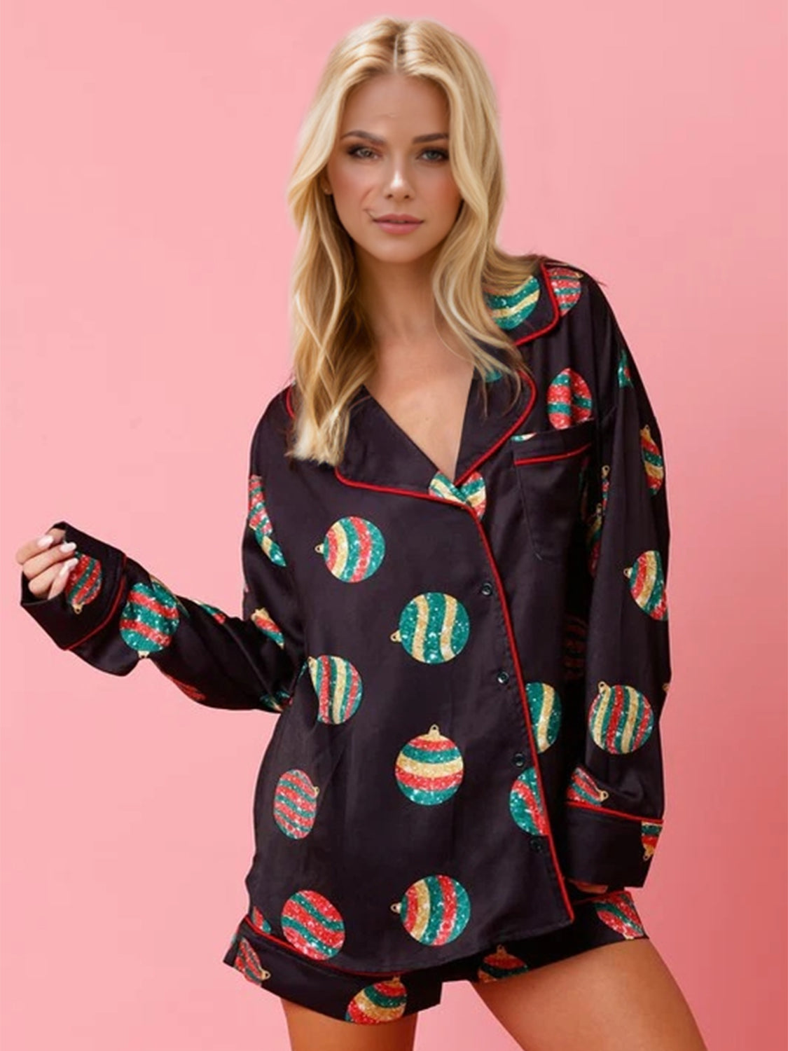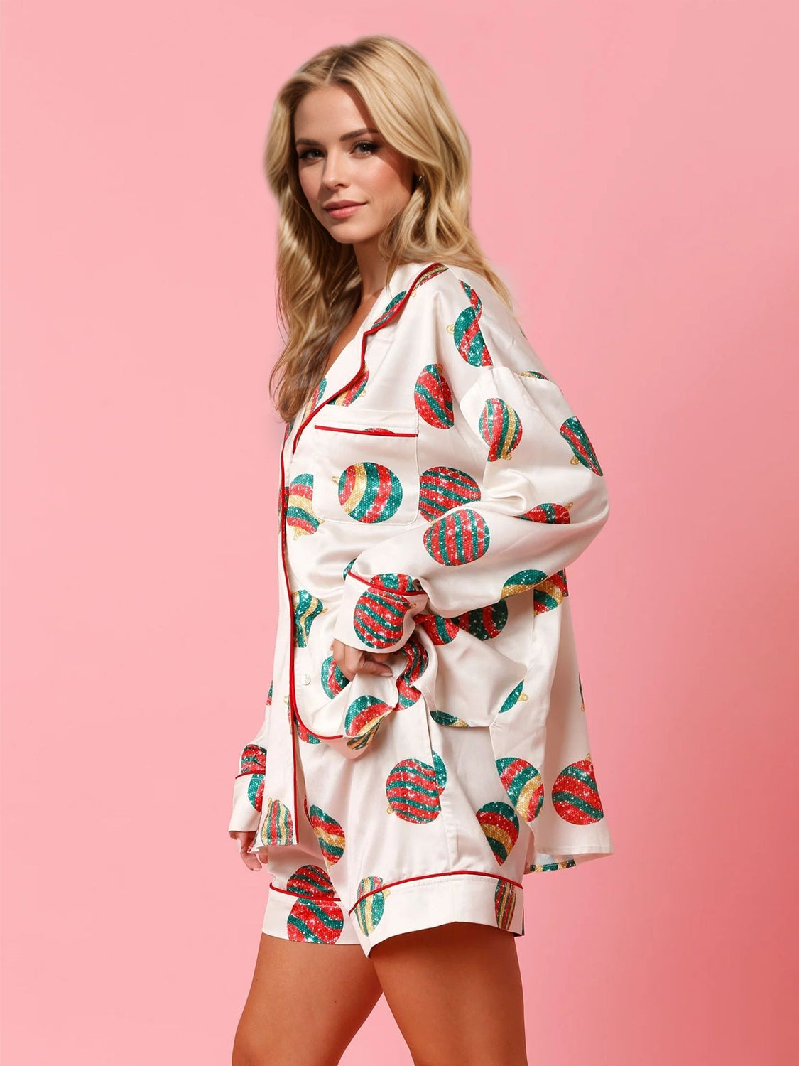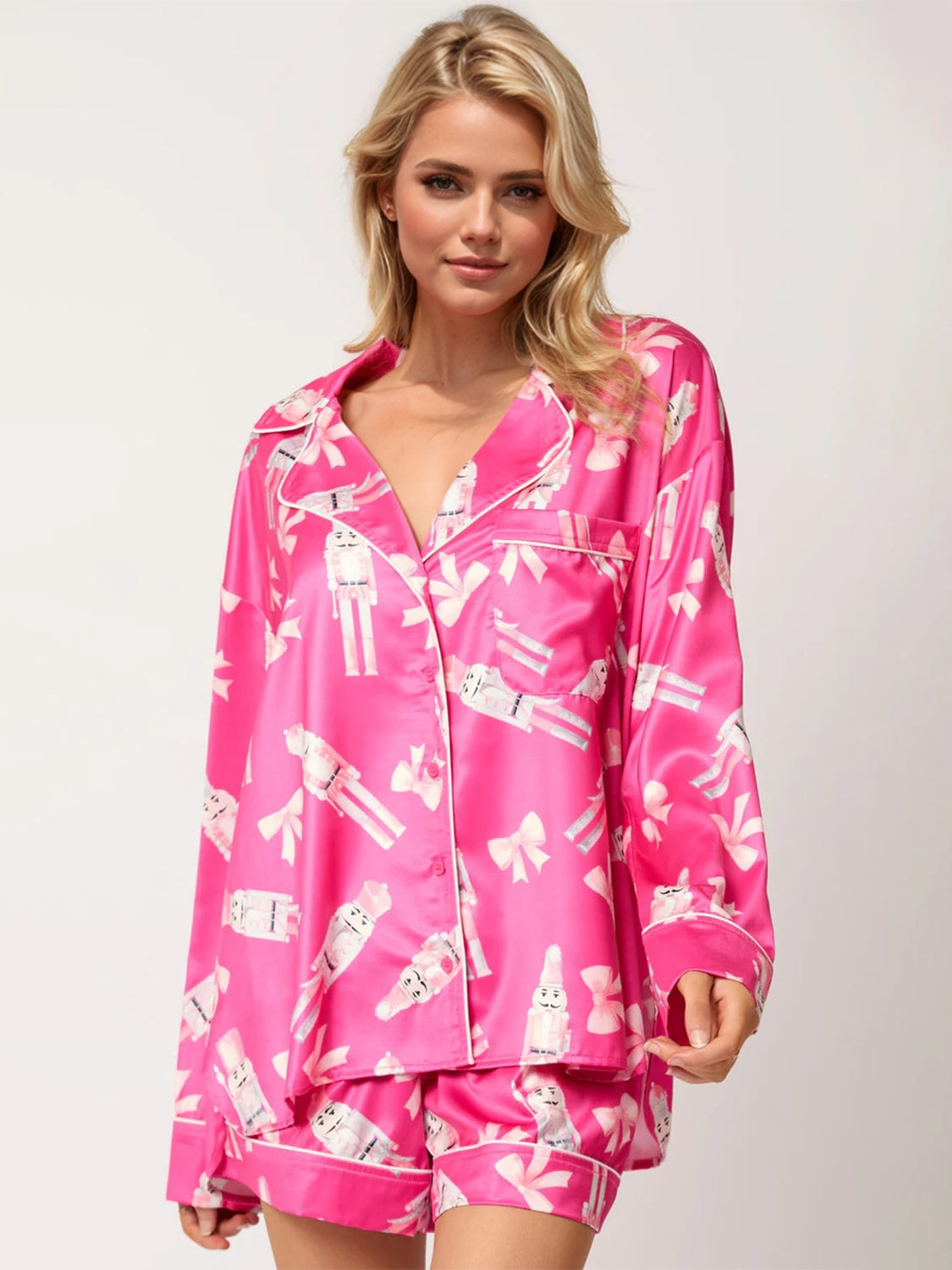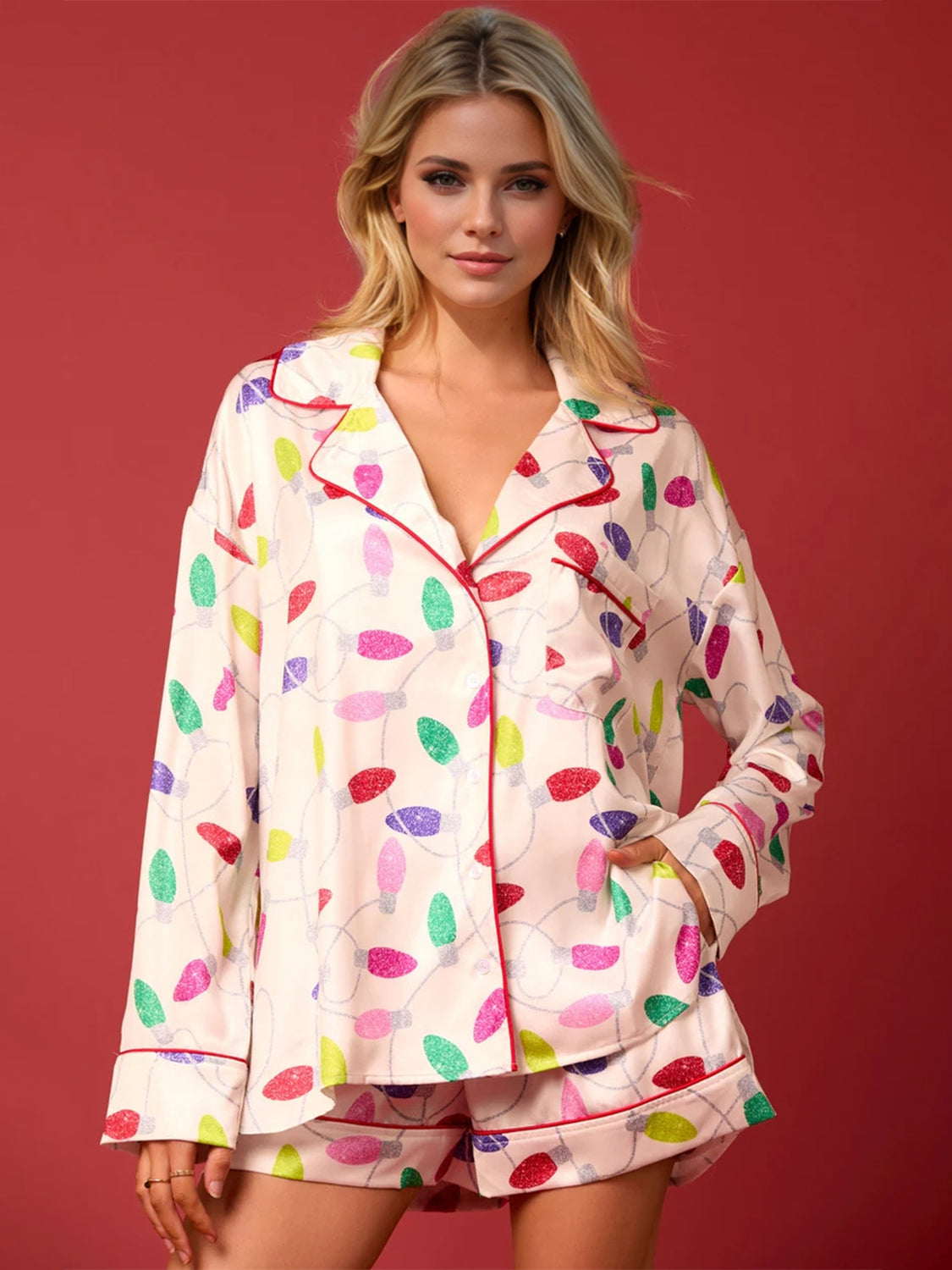 Printed Collared Neck Long Sleeve Top and Shorts Set