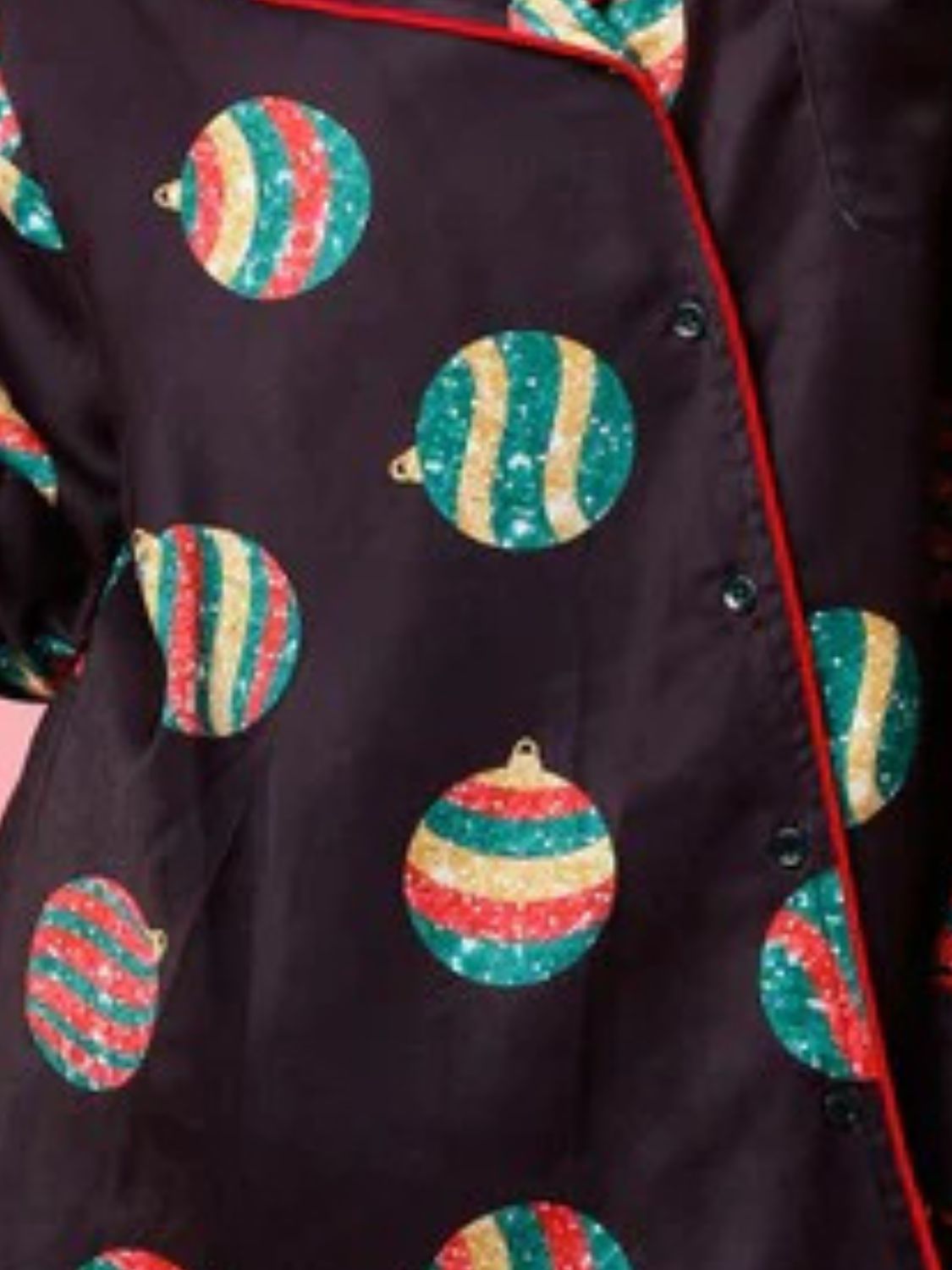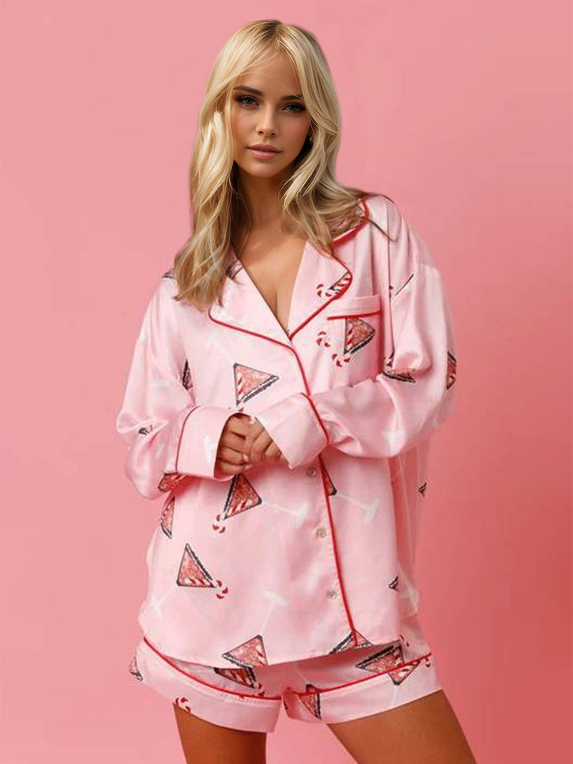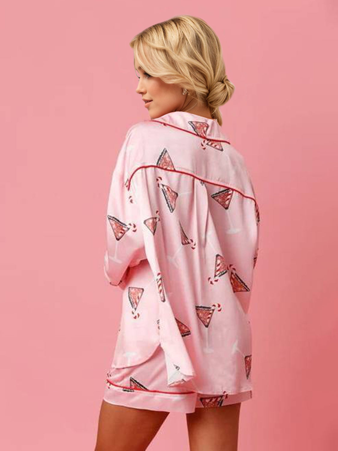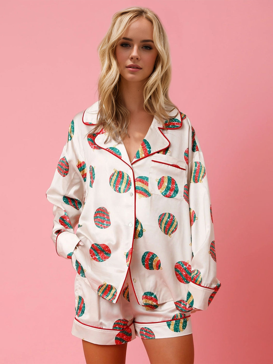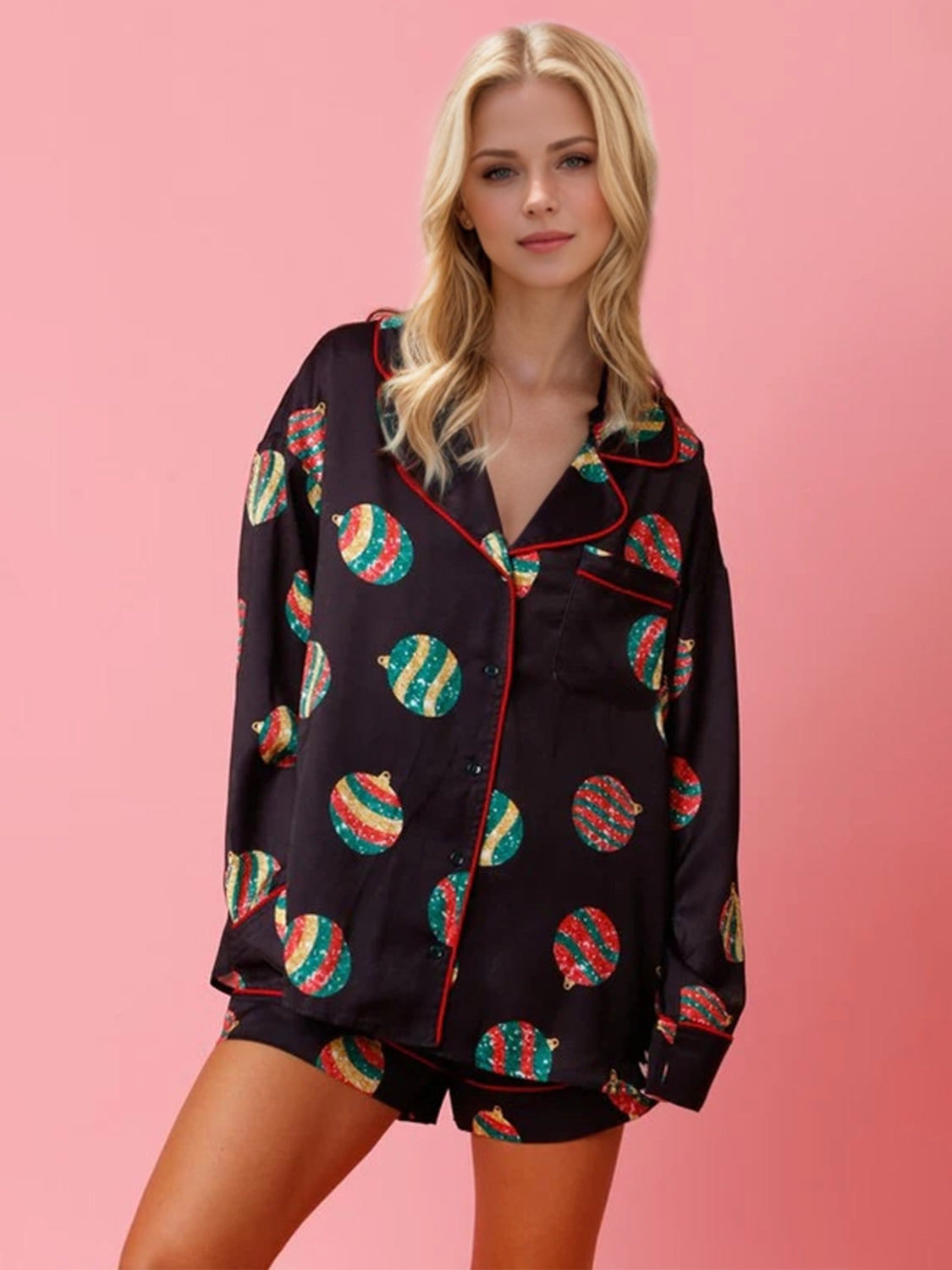 Printed Collared Neck Long Sleeve Top and Shorts Set