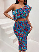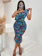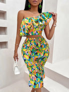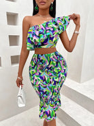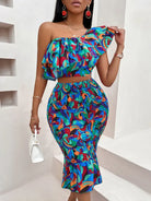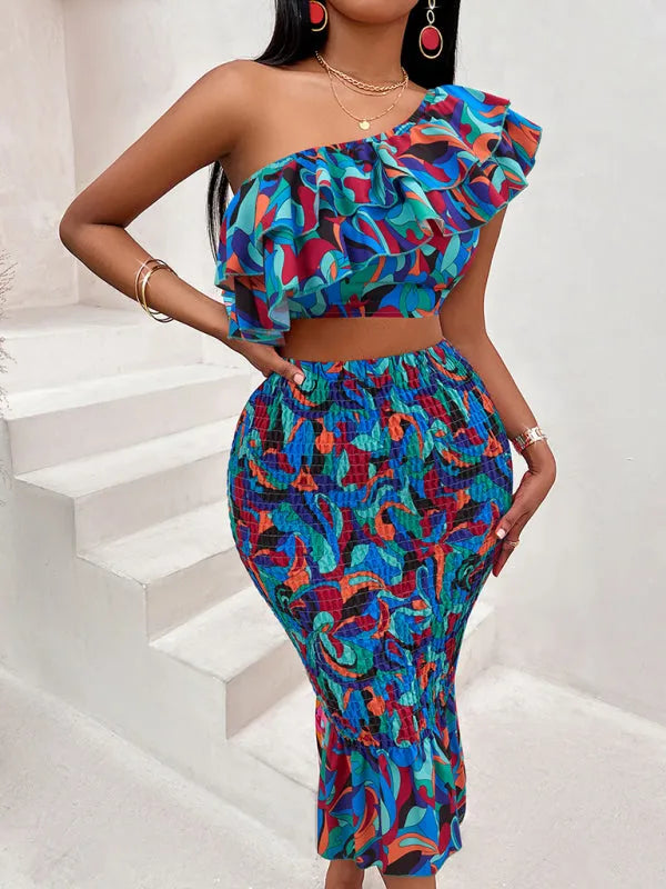 Off-shoulder lotus leaf print women's suit