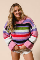 Add a fun and vibrant touch to your wardrobe with this Multi Color Stripes Cropped Sweater. The colorful stripe pattern brings a playful and trendy vibe to this cropped silhouette. Perfect for layering over high-waisted jeans or skirts, this sweater is a versatile piece for casual or dressed-up looks. The cropped length adds a modern twist to the classic sweater style, making it a statement piece in your closet. Stay stylish and on-trend with this eye-catching sweater that is sure to brighten up your outfit.