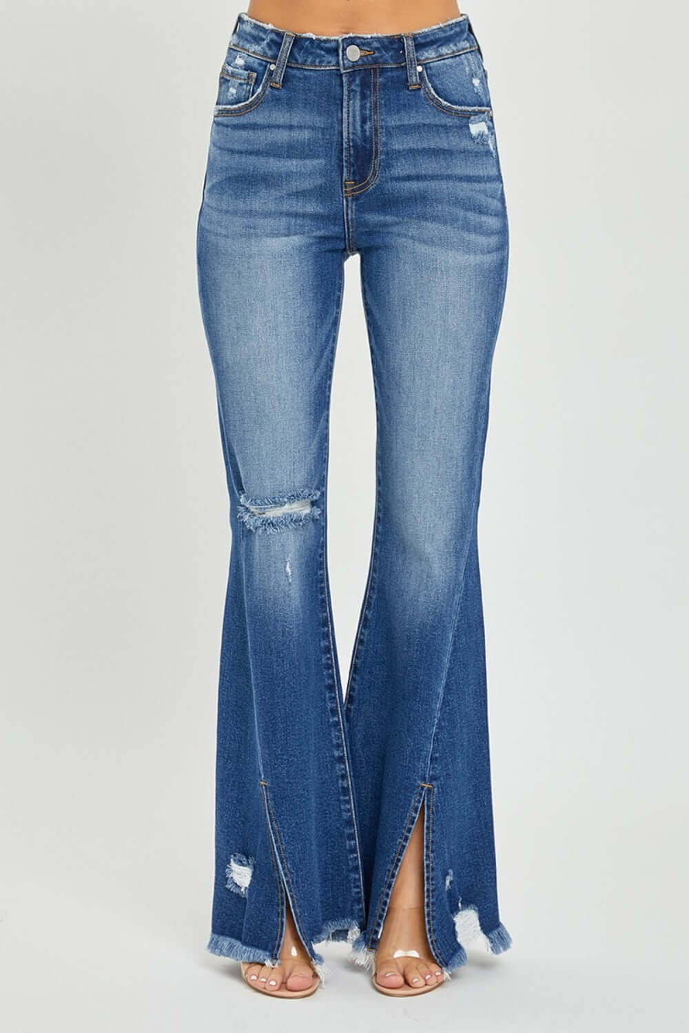 RISEN Full Size High Rise Front Slit Frayed Hem Flare Jeans